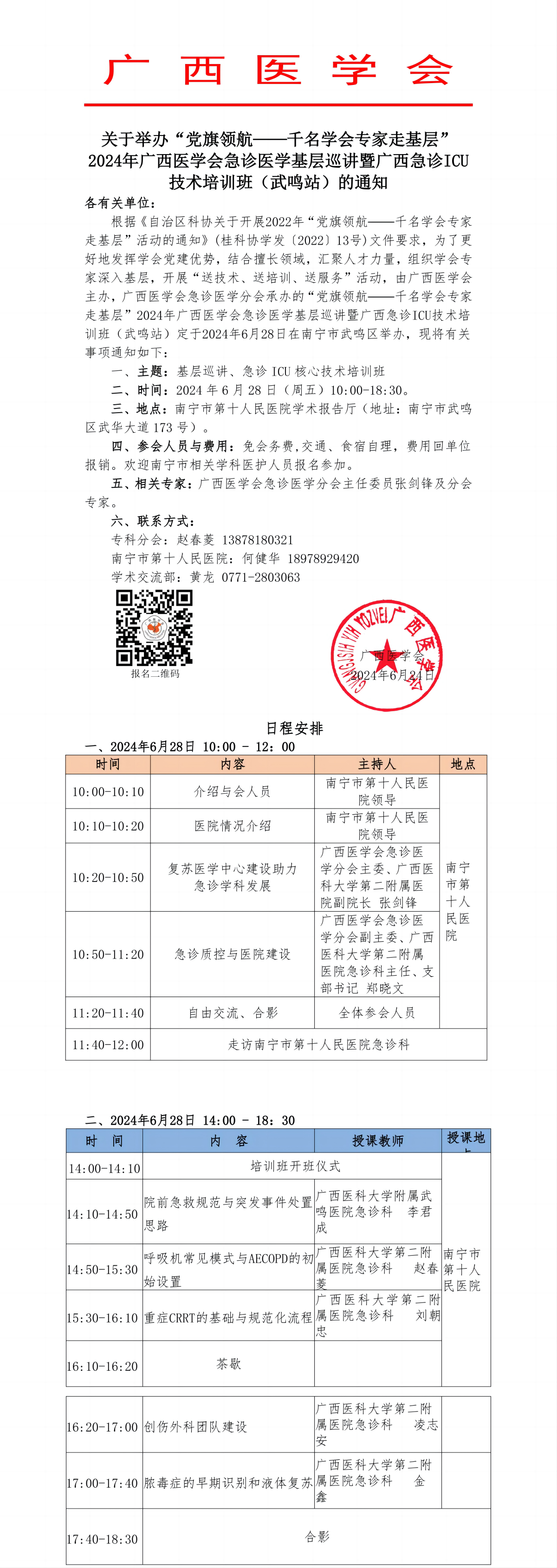关于举办“党旗领航——千名学会专家走基层” 2024年广西医学会急诊医学基层巡讲暨广西急诊ICU技术培训班(武鸣站)的通知