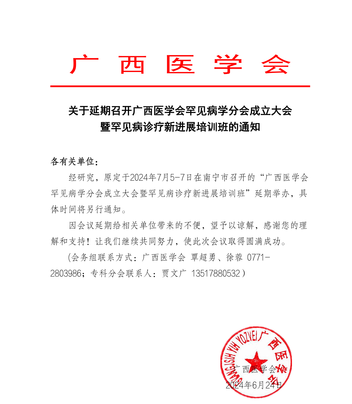关于延期召开广西医学会罕见病学分会成立大会暨罕见病诊疗新进展培训班的通知