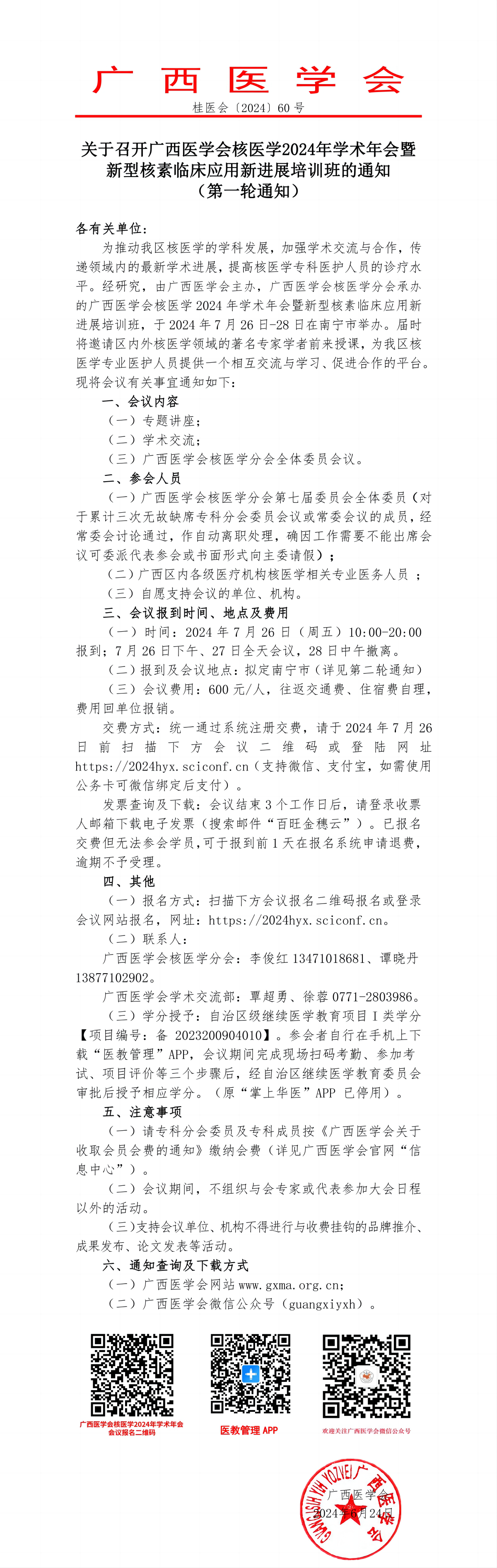 关于召开广西医学会核医学2024年学术年会暨新型核素临床应用新进展培训班的通知(第一轮通知)