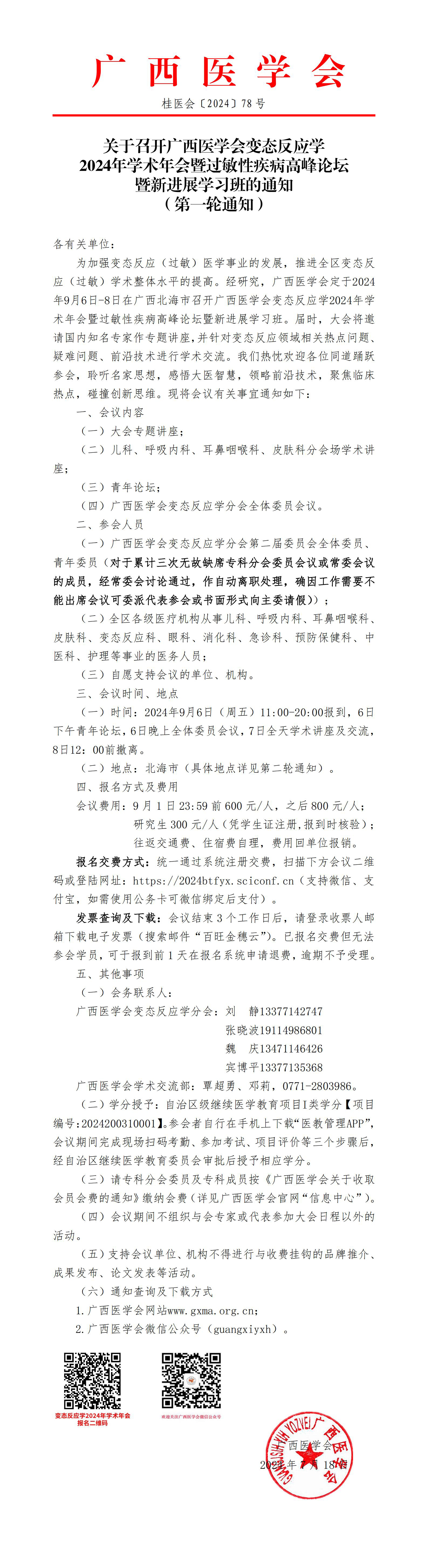 关于召开广西医学会变态反应学2024年学术年会暨过敏性疾病高峰论坛暨新进展学习班的通知(第一轮通知)