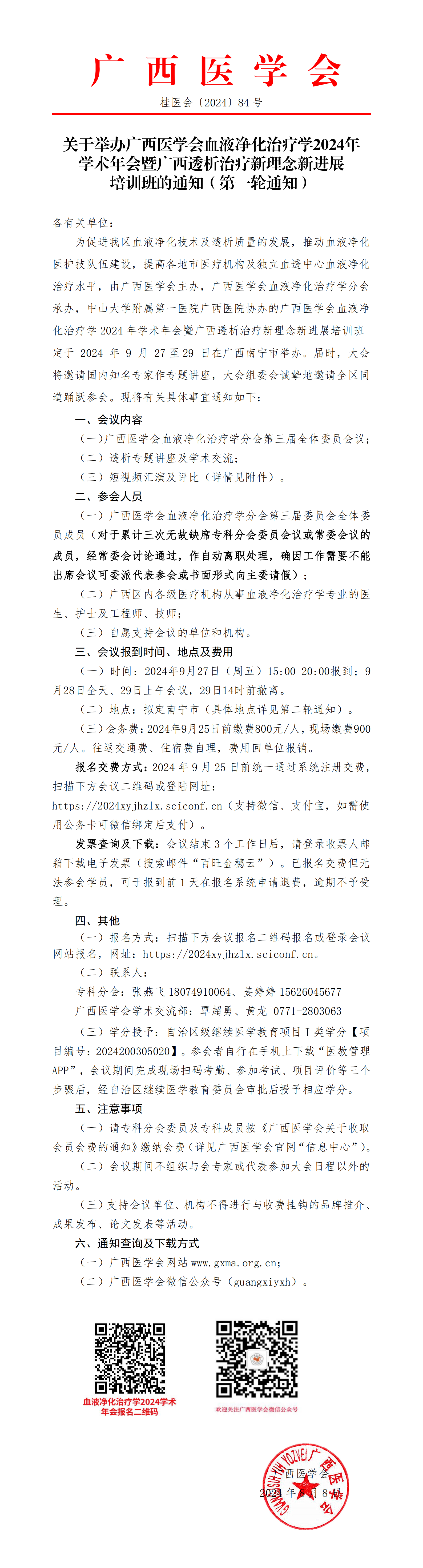 关于举办广西医学会血液净化治疗学2024年学术年会暨广西透析治疗新理念新进展培训班的通知(第一轮通知)