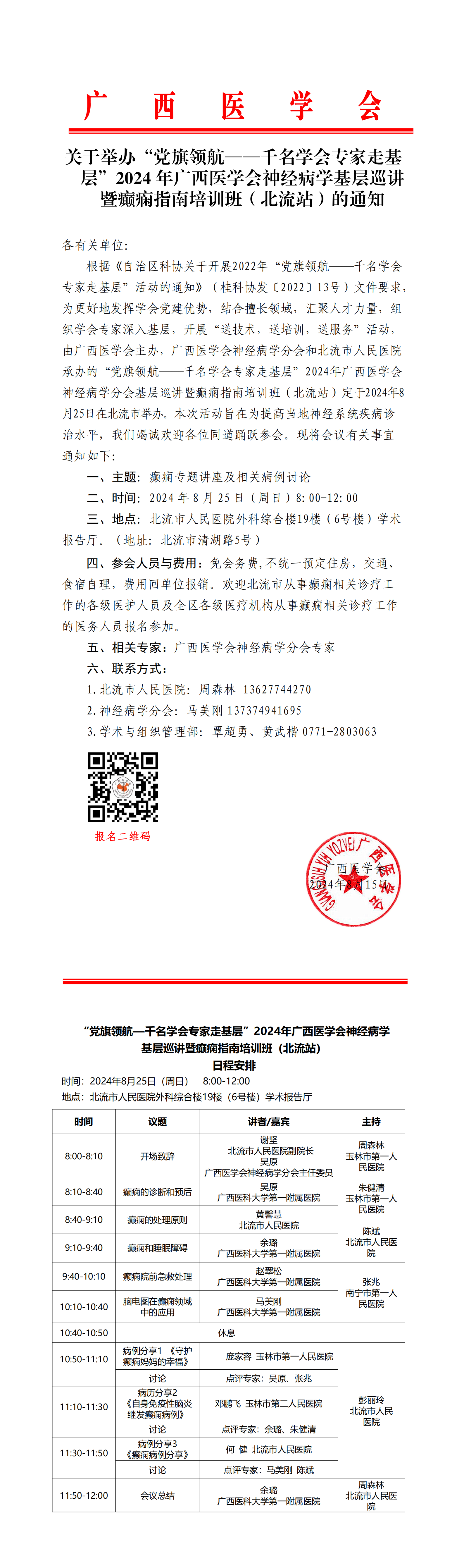 关于举办“党旗领航——千名学会专家走基层”2024年广西医学会神经病学基层巡讲暨癫痫指南培训班(北流站)的通知