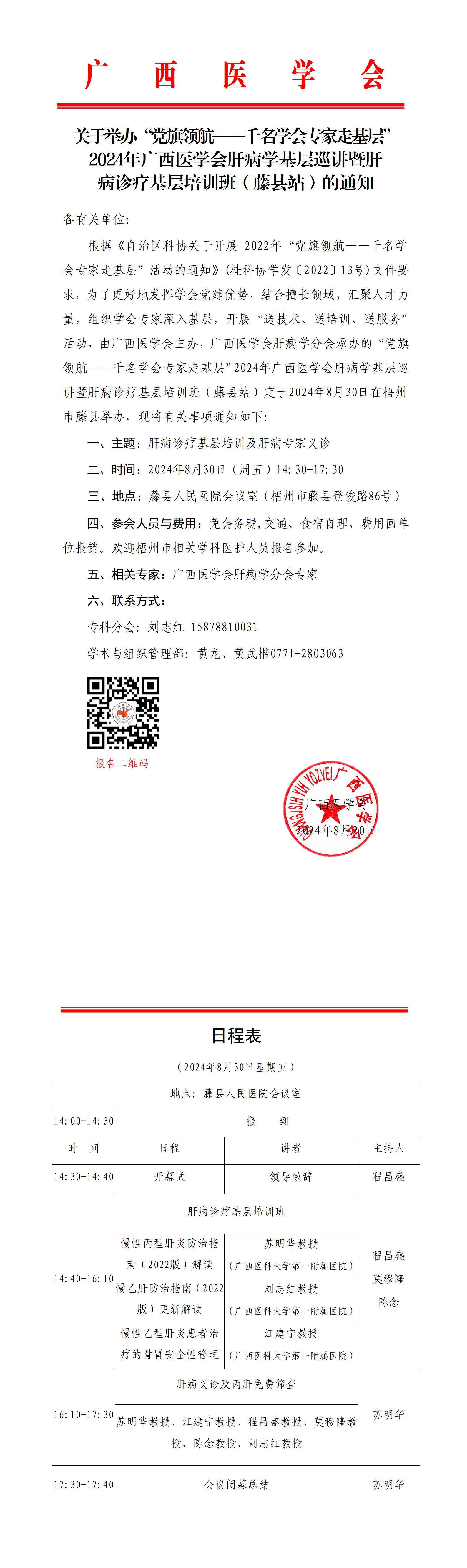 关于举办“党旗领航——千名学会专家走基层” 2024年广西医学会肝病学基层巡讲暨肝病诊疗基层培训班(藤县站)的通知