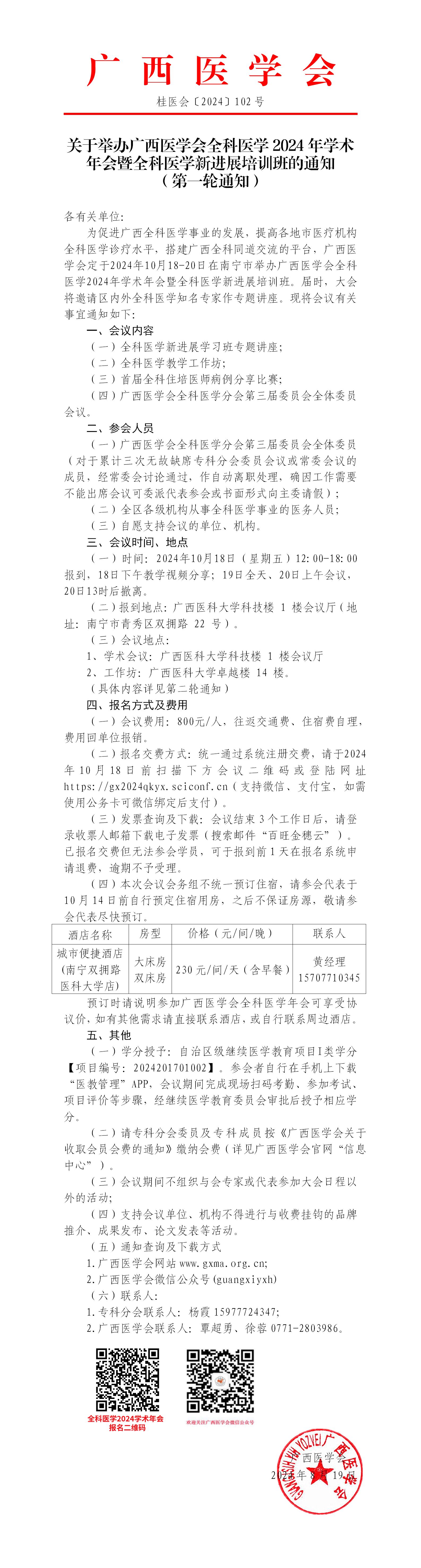 关于举办广西医学会全科医学2024年学术年会暨全科医学新进展培训班的通知 (第一轮通知)