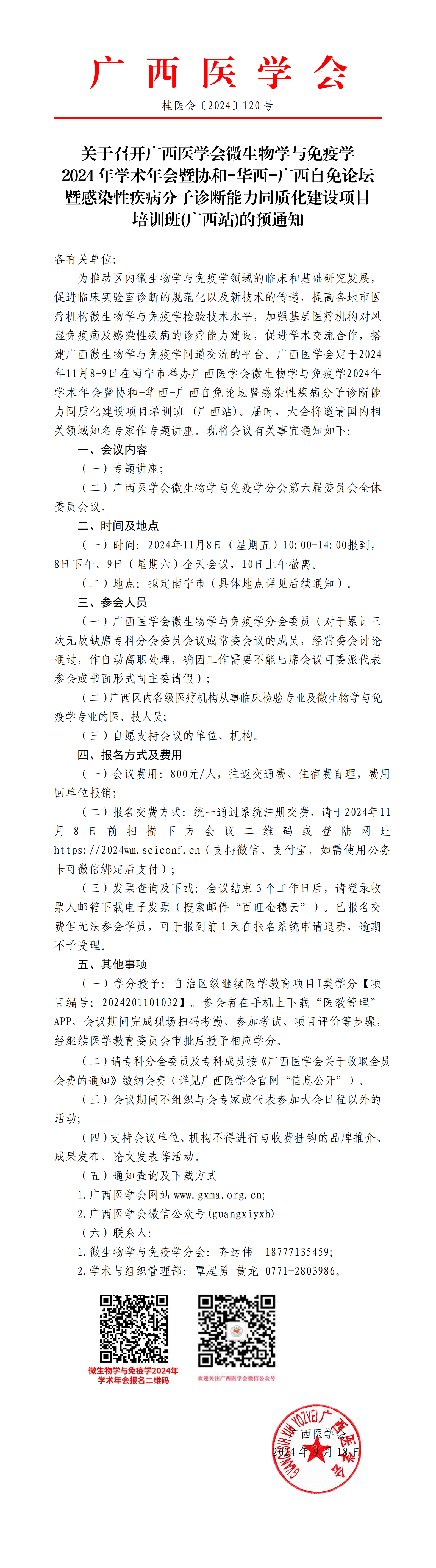 关于召开广西医学会微生物学与免疫学2024年学术年会暨协和-华西-广西自免论坛暨感染性疾病分子诊断能力同质化建设项目培训班(广西站)的预通知
