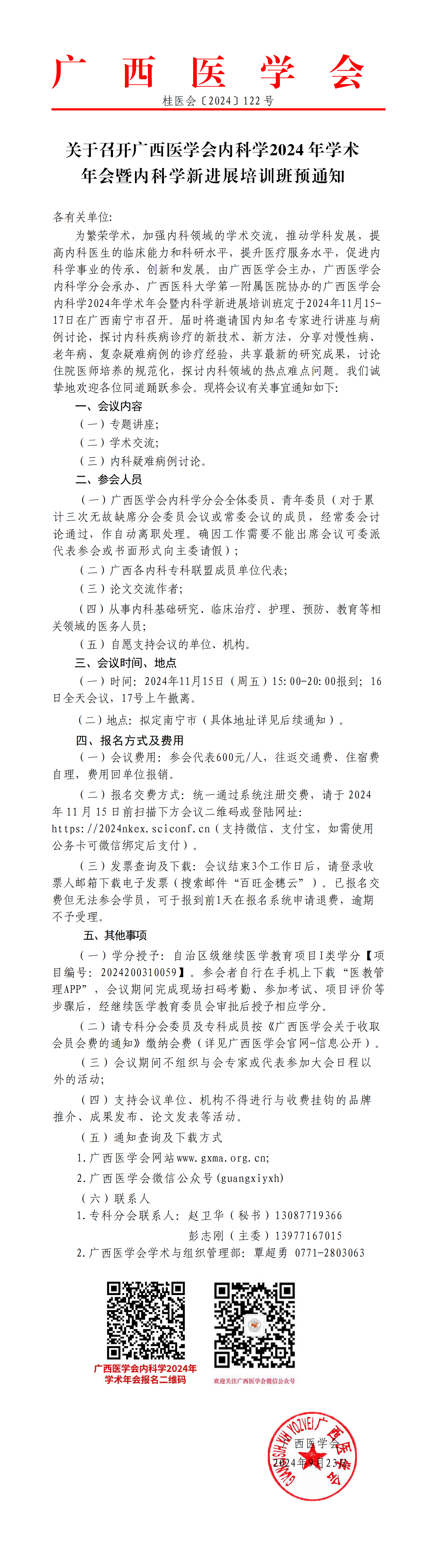关于召开广西医学会内科学2024 年学术年会暨内科学新进展培训班预通知