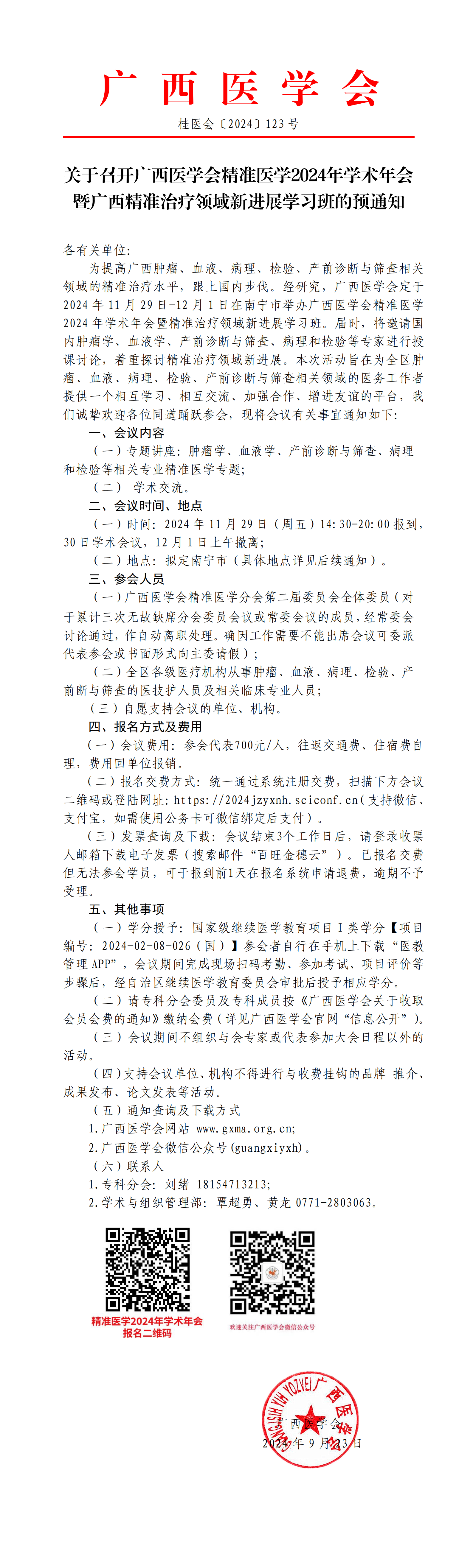 关于召开广西医学会精准医学2024年学术年会暨广西精准治疗领域新进展学习班的预通知