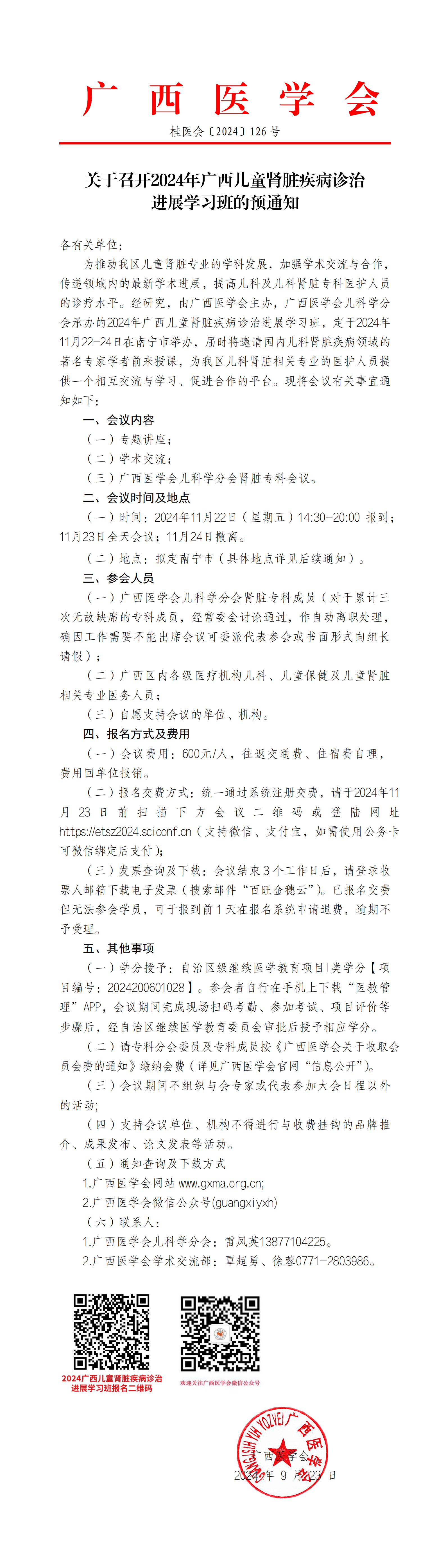 关于召开2024年广西儿童肾脏疾病诊治进展学习班的预通知