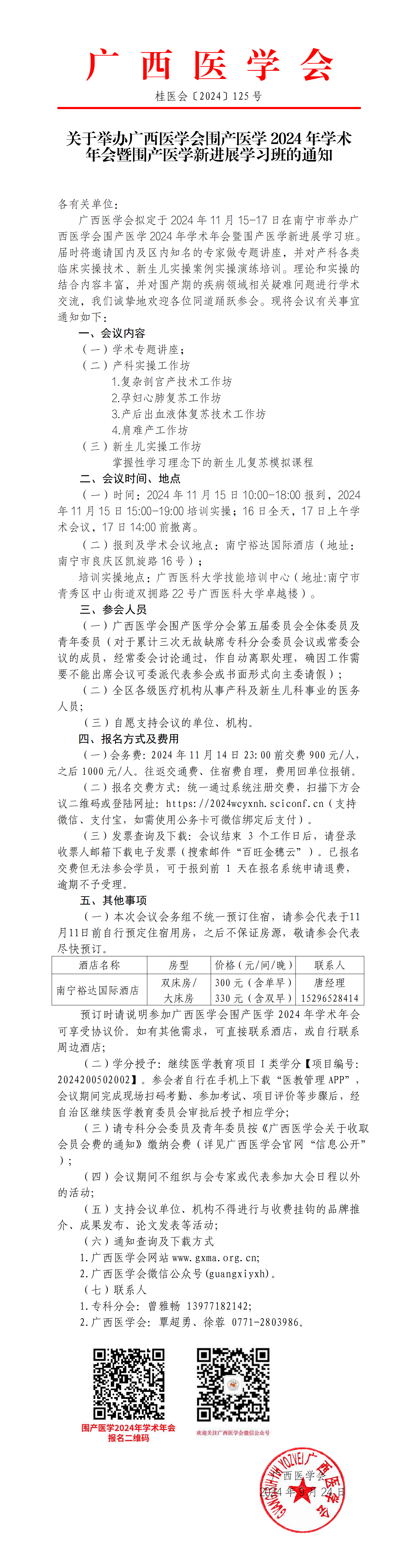 关于举办广西医学会围产医学2024年学术年会暨围产医学新进展学习班的通知