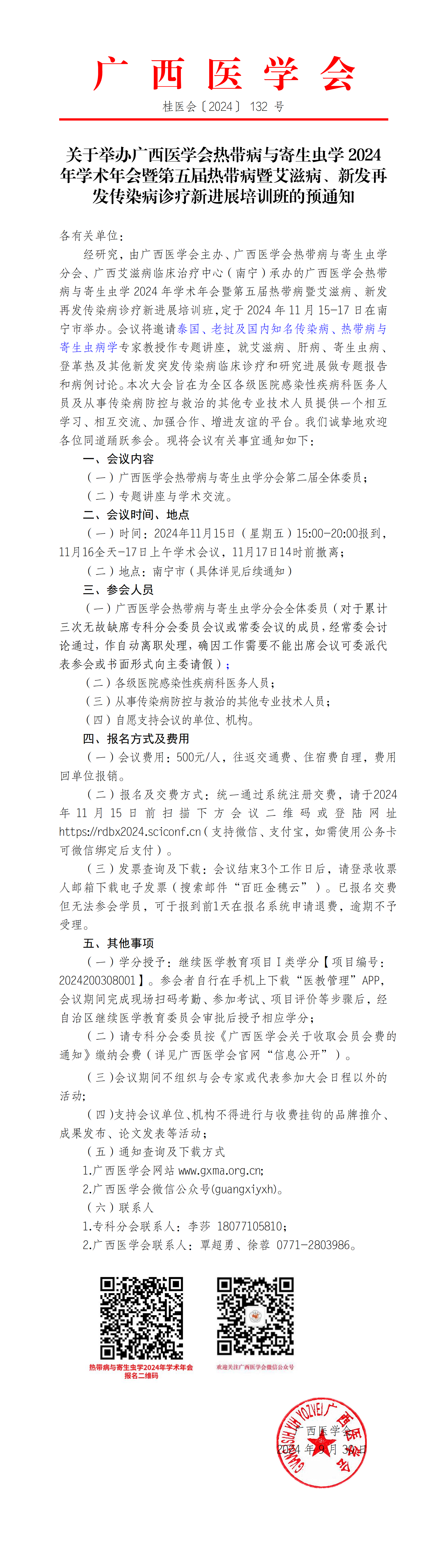 关于举办广西医学会热带病与寄生虫学2024年学术年会暨第五届热带病暨艾滋病、新发再发传染病诊疗新进展培训班的预通知