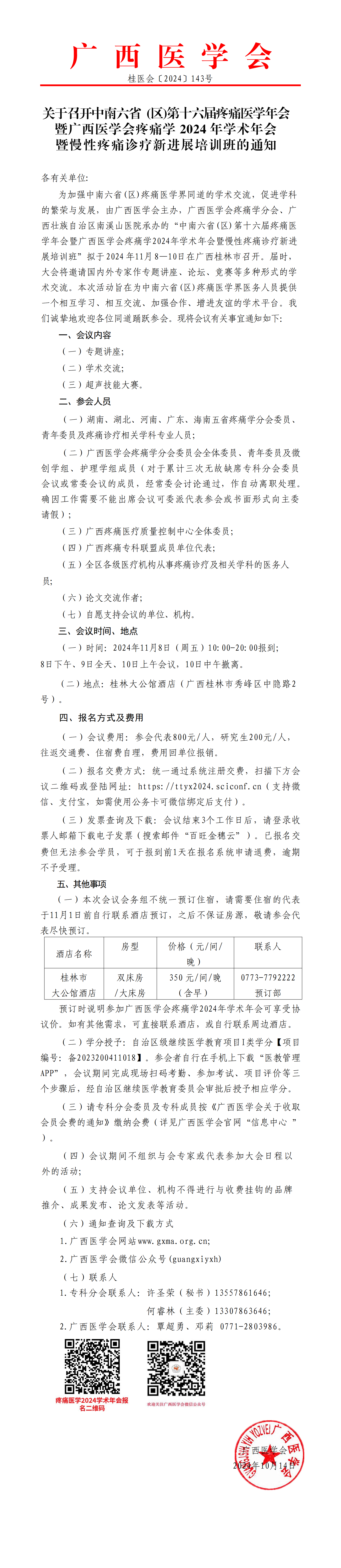 关于召开中南六省 (区)第十六届疼痛医学年会暨广西医学会疼痛学 2024 年学术年会暨慢性疼痛诊疗新进展培训班的通知