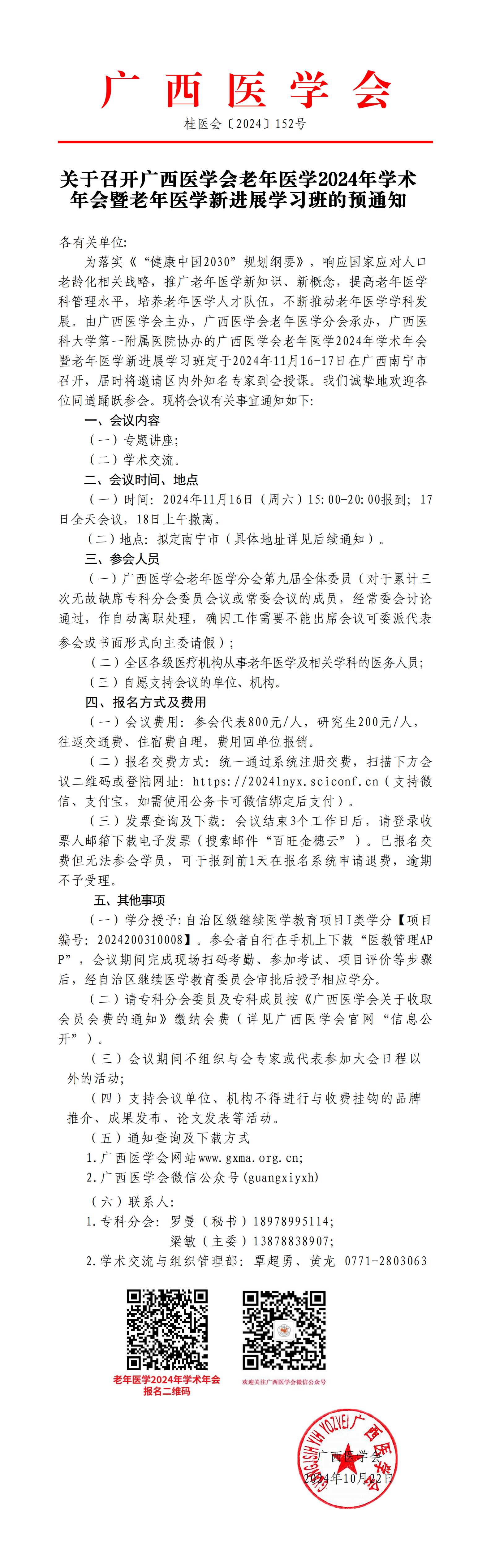 关于召开广西医学会老年医学2024年学术年会暨老年医学新进展学习班的预通知
