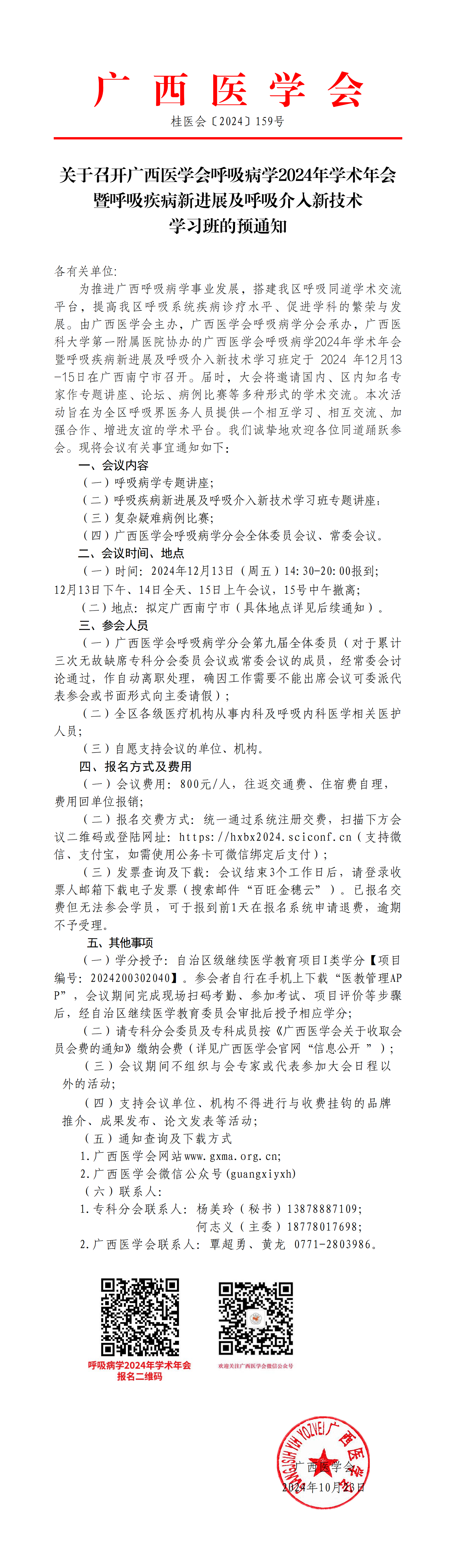 关于召开广西医学会呼吸病学2024年学术年会暨呼吸疾病新进展及呼吸介入新技术学习班的预通知