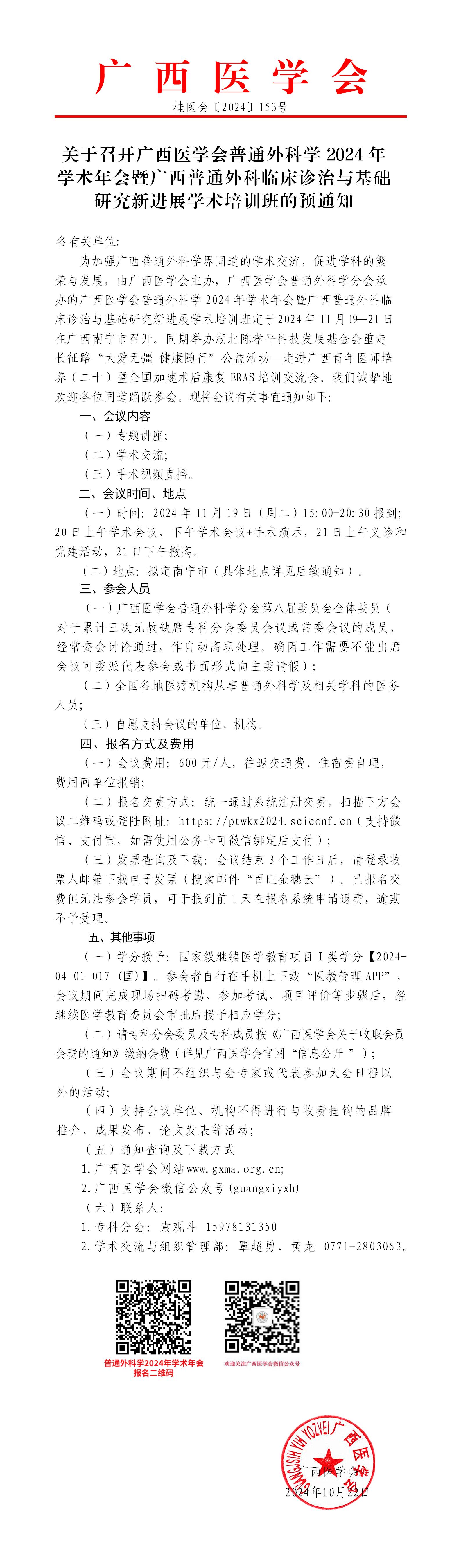 关于召开广西医学会普通外科学2024年学术年会暨广西普通外科临床诊治与基础研究新进展学术培训班的预通知