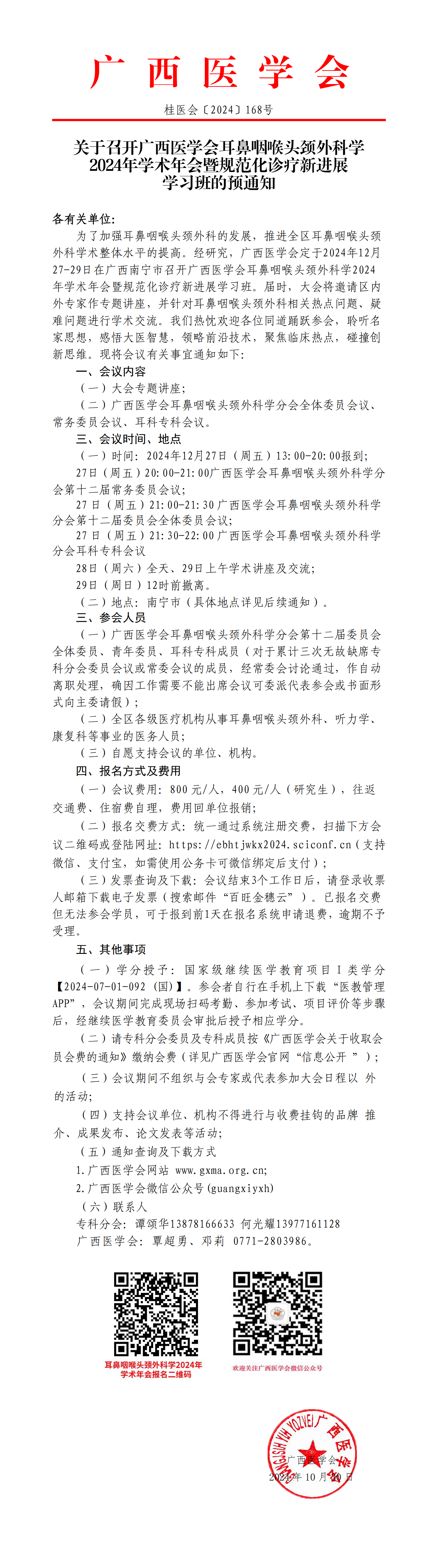 关于召开广西医学会耳鼻咽喉头颈外科学2024年学术年会暨规范化诊疗新进展学习班的预通知