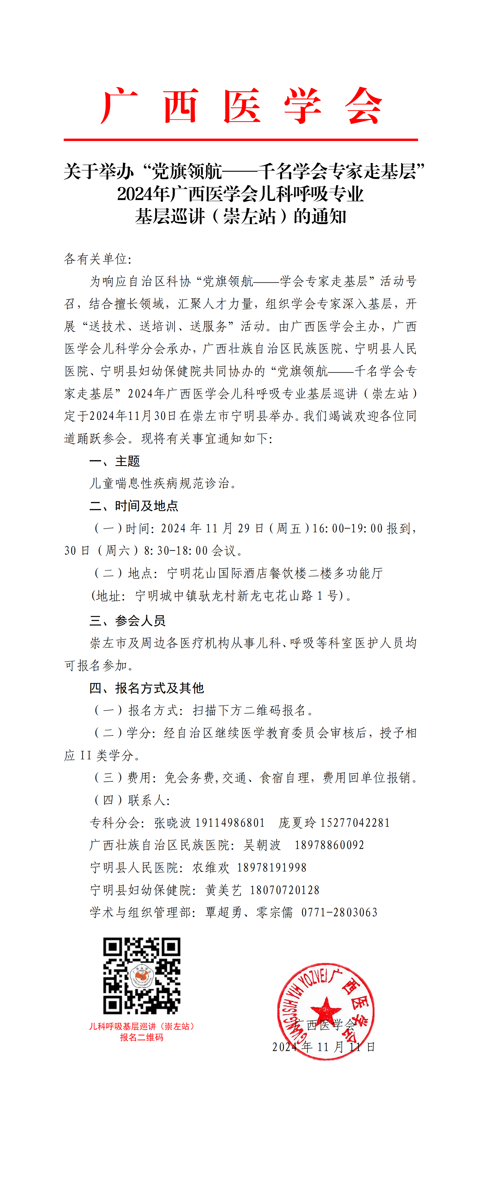 关于举办“党旗领航——千名学会专家走基层”2024年广西医学会儿科呼吸专业基层巡讲(崇左站)的通知
