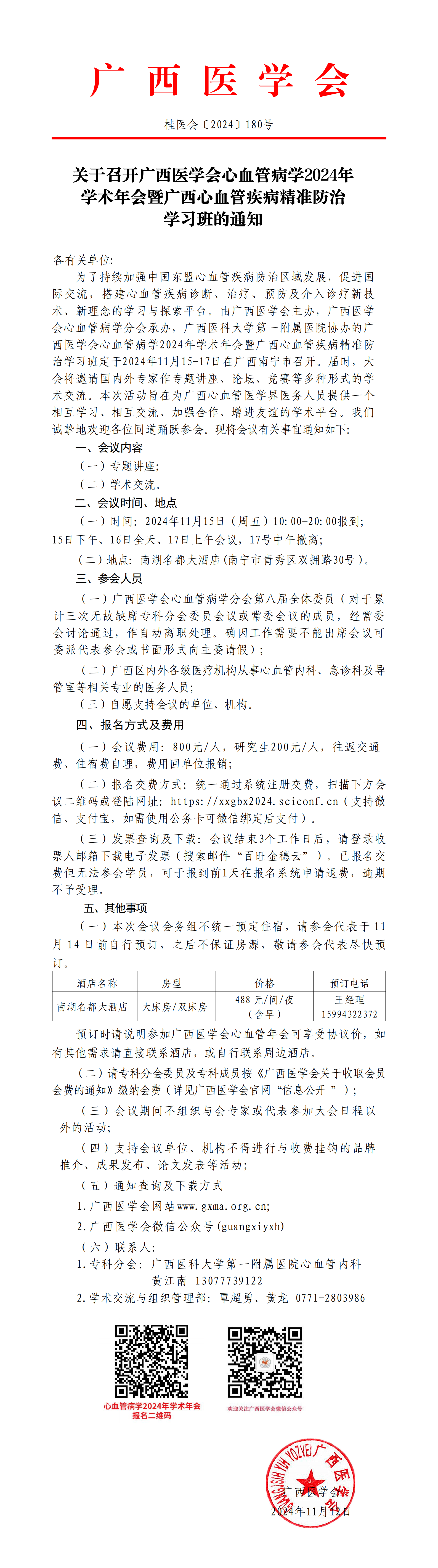 关于召开广西医学会心血管病学2024年 学术年会暨广西心血管疾病精准防治学习班的通知