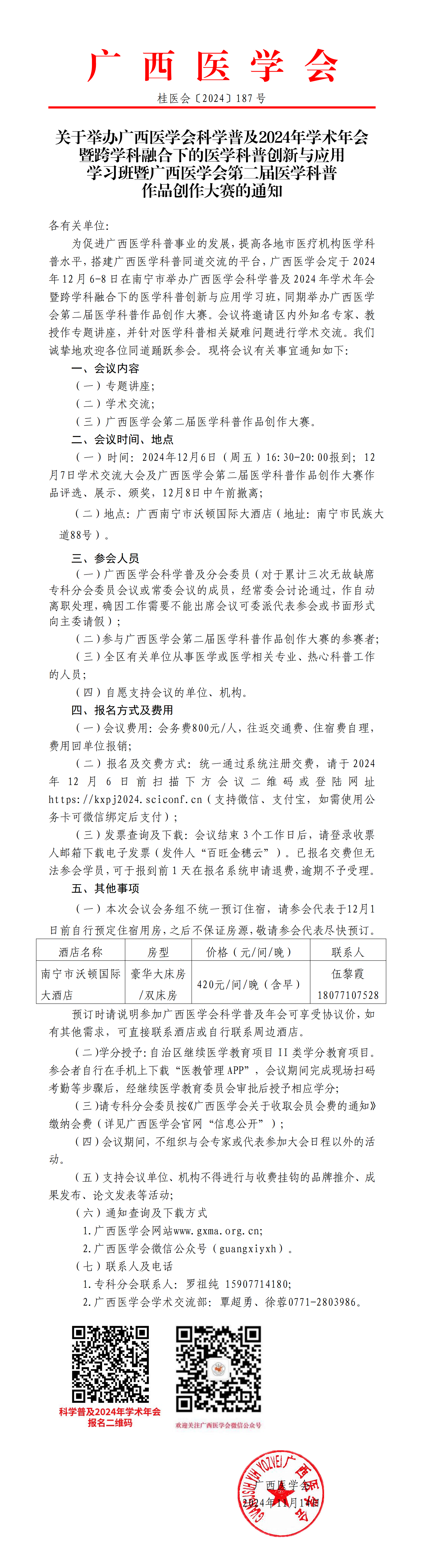 关于举办广西医学会科学普及2024年学术年会暨跨学科融合下的医学科普创新与应用学习班暨广西医学会第二届医学科普作品创作大赛的通知