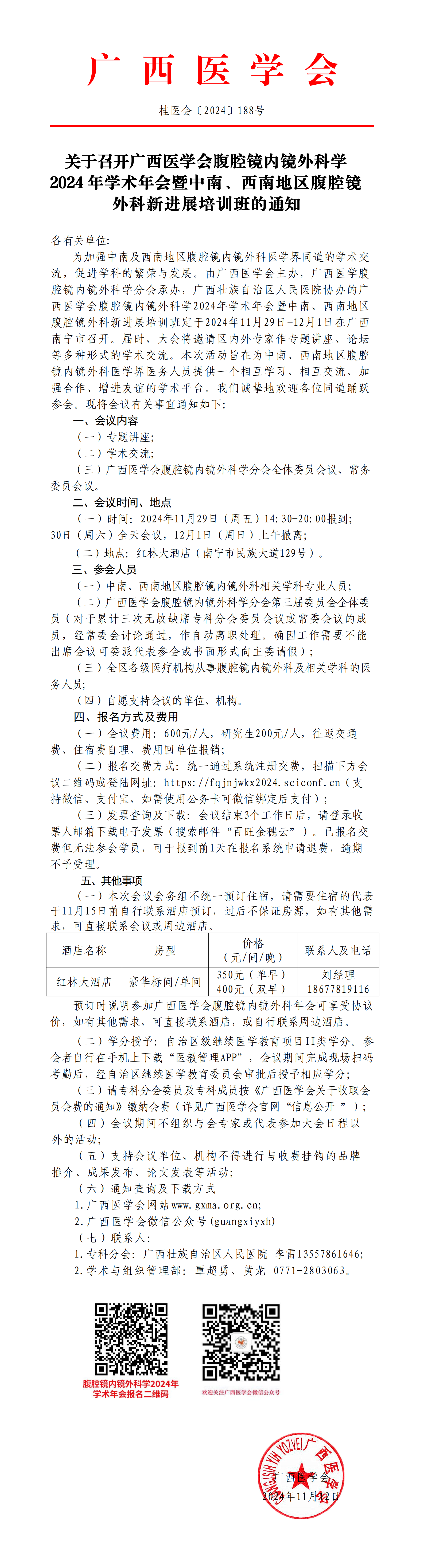 关于召开广西医学会腹腔镜内镜外科学 2024 年学术年会暨中南、西南地区腹腔镜外科新进展培训班的通知