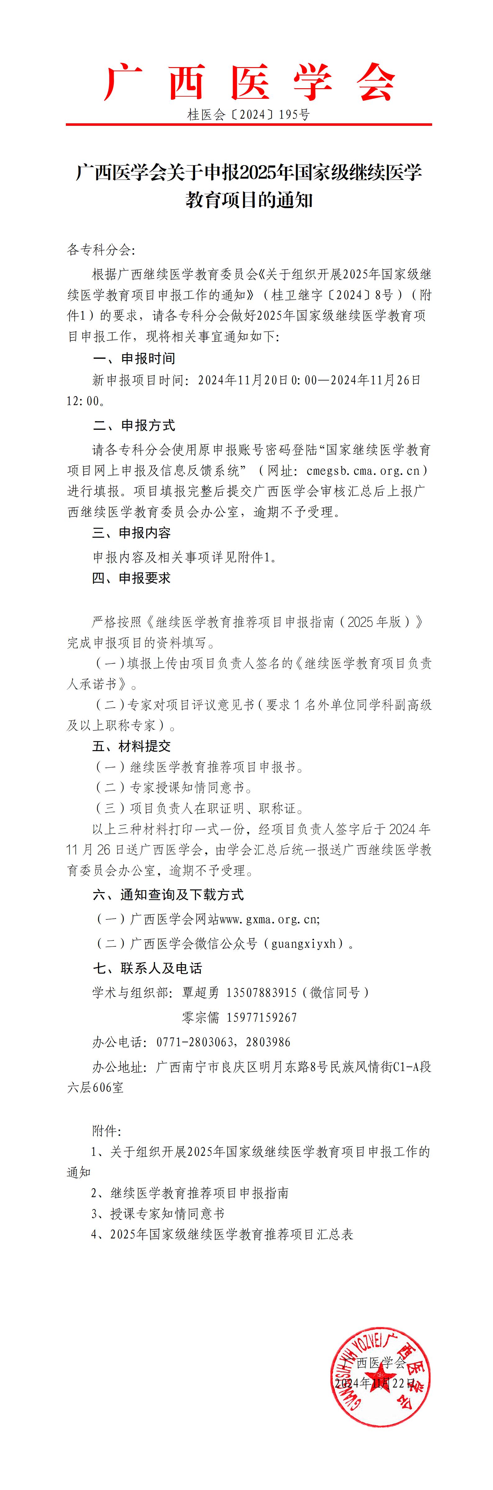 广西医学会关于申报2025年国家级继续医学教育项目的通知