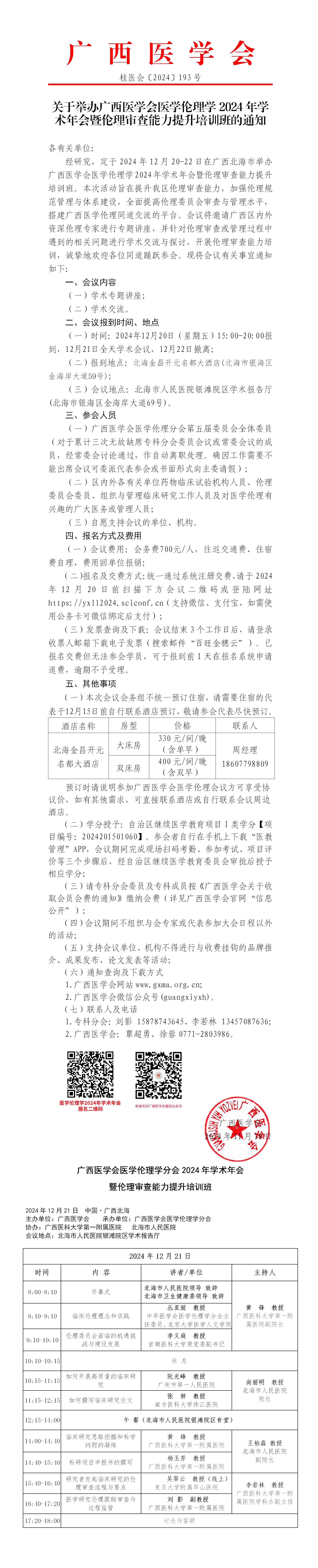 关于举办广西医学会医学伦理学2024年学术年会暨伦理审查能力提升培训班的通知