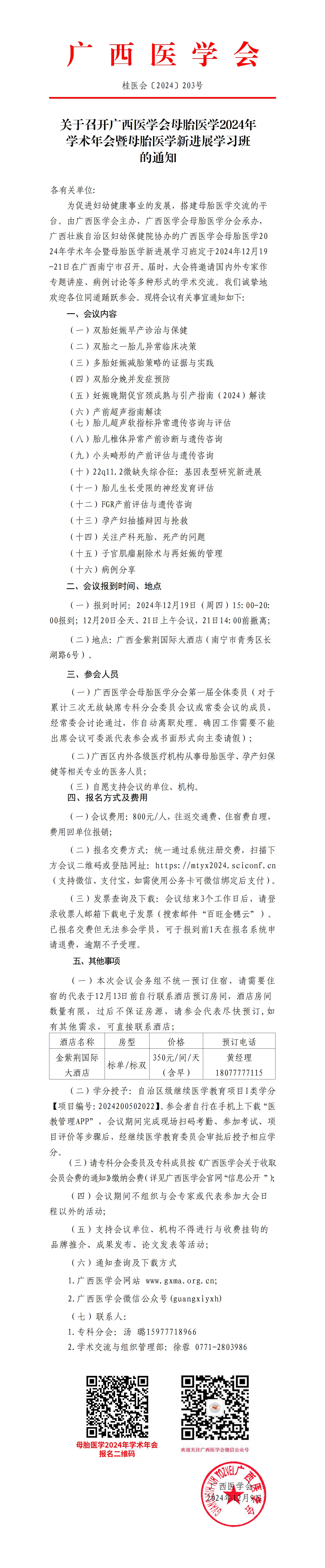 关于召开广西医学会母胎医学2024年学术年会暨母胎医学新进展学习班 的通知