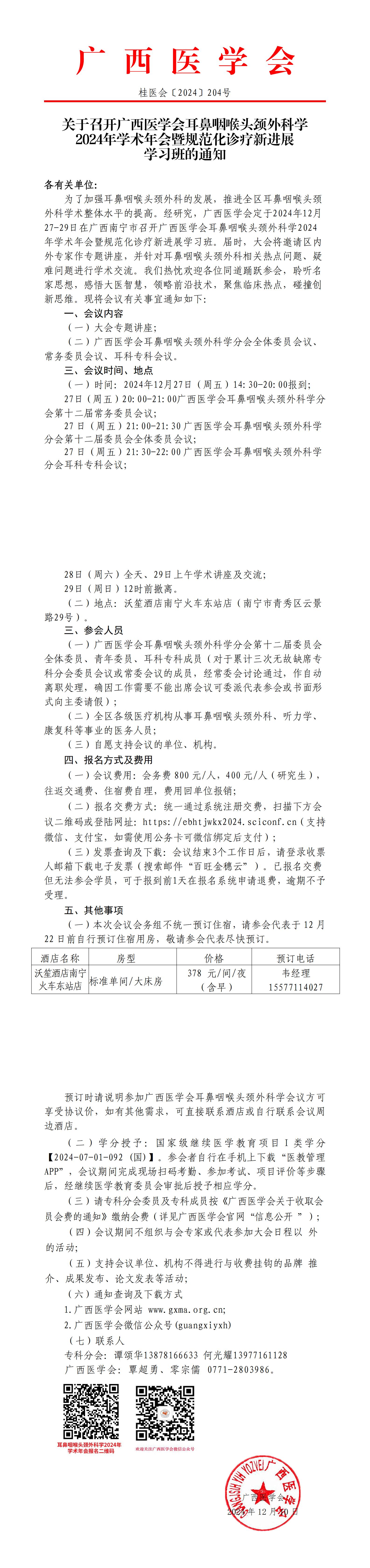 关于召开广西医学会耳鼻咽喉头颈外科学2024年学术年会暨规范化诊疗新进展学习班的通知