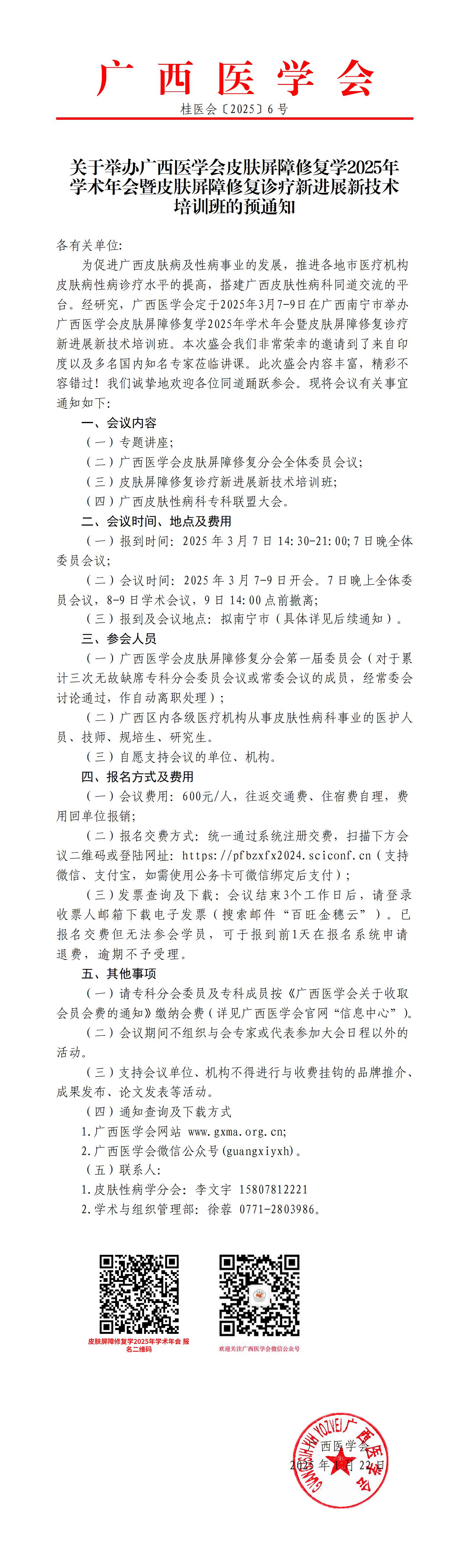 关于举办广西医学会皮肤屏障修复学2025年学术年会暨皮肤屏障修复诊疗新进展新技术培训班的预通知