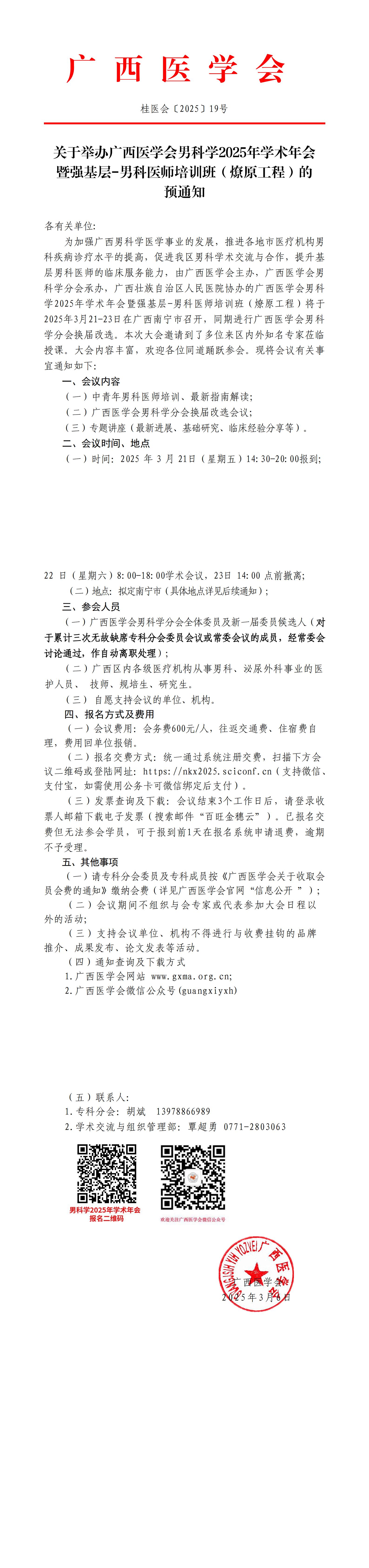 关于举办广西医学会男科学2025年学术年会暨强基层-男科医师培训班(燎原工程)的 预通知