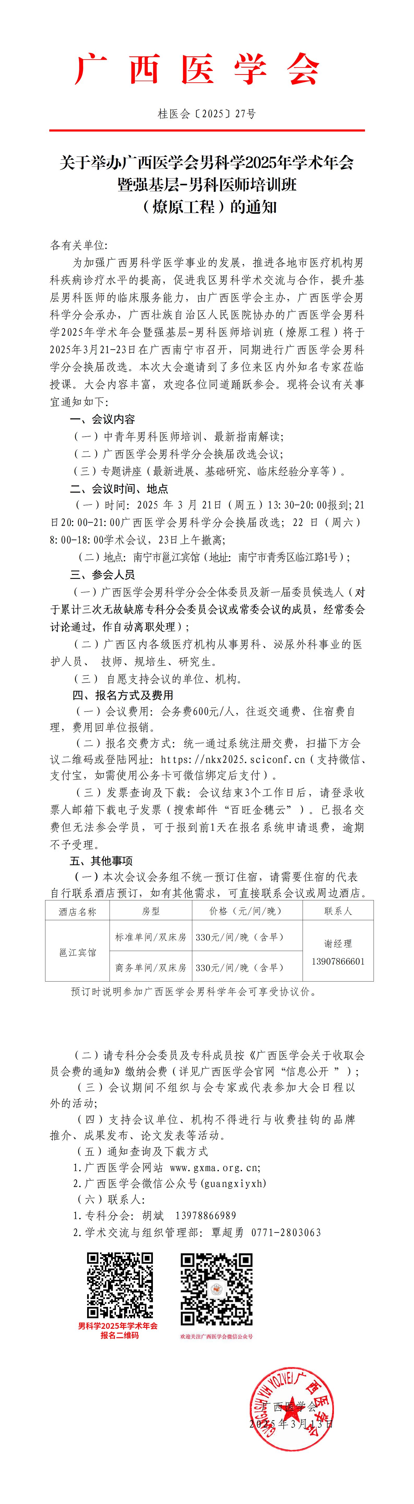 关于举办广西医学会男科学2025年学术年会暨强基层-男科医师培训班(燎原工程)的通知