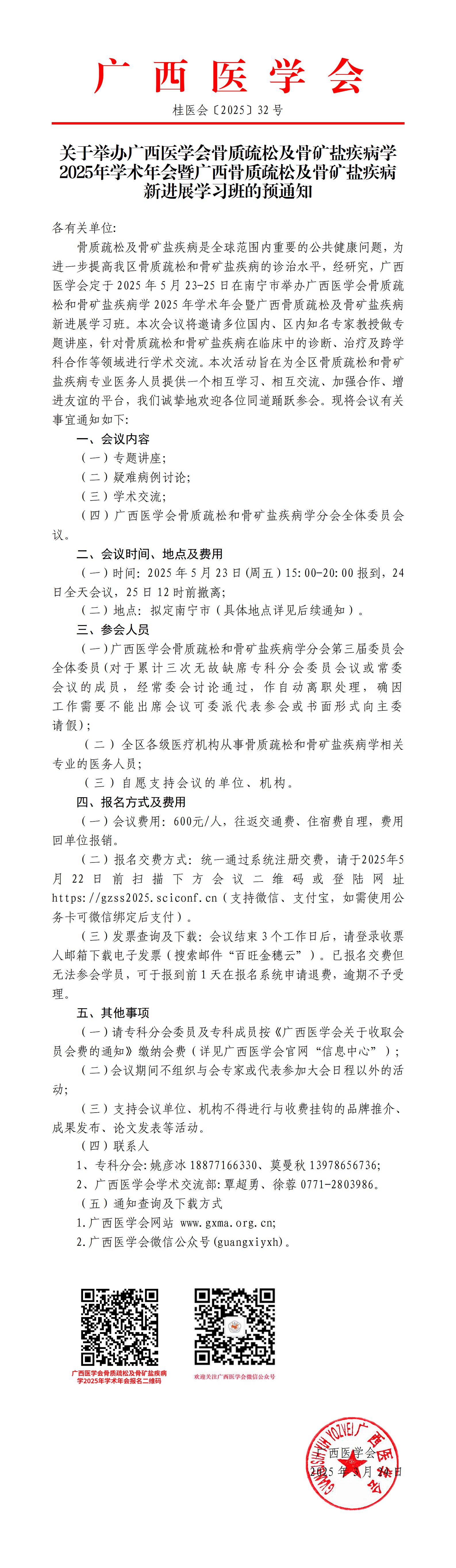 关于举办广西医学会骨质疏松及骨矿盐疾病学2025年学术年会暨广西骨质疏松及骨矿盐疾病新进展学习班的预通知