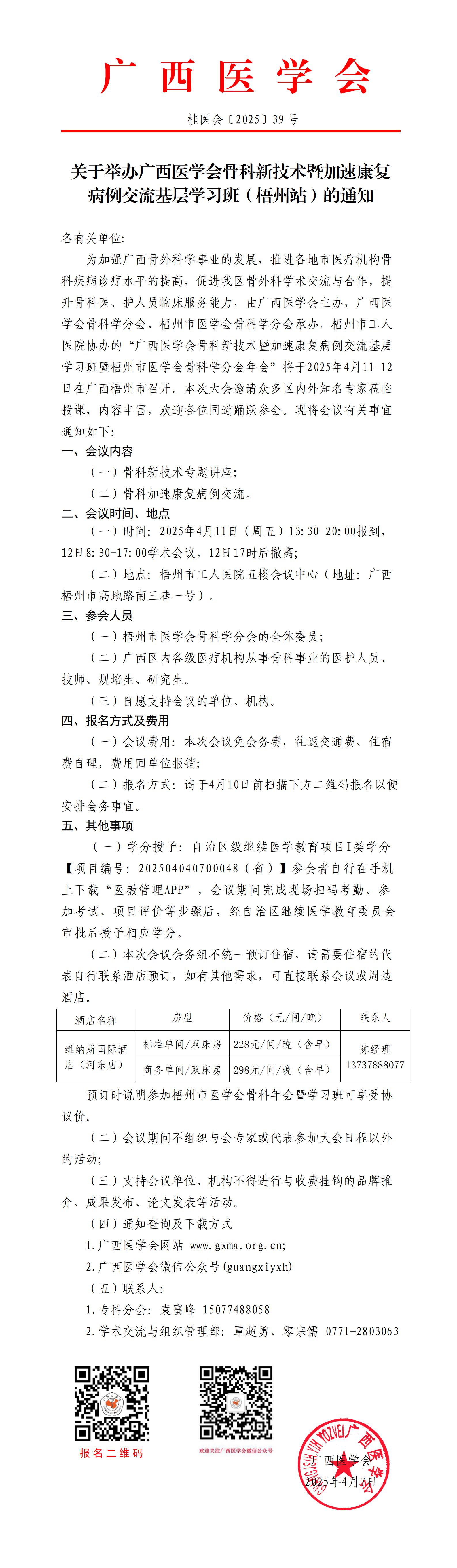 关于举办广西医学会骨科新技术暨加速康复病例交流基层学习班(梧州站)的通知