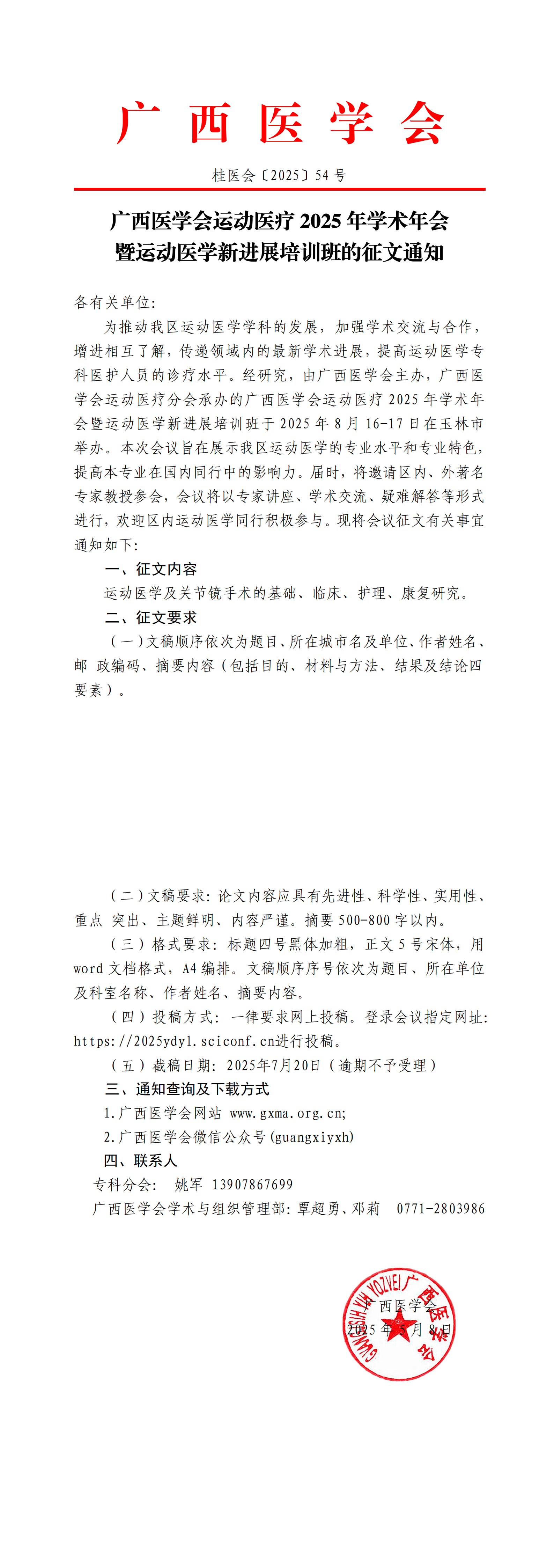 广西医学会运动医疗2025年学术年会暨运动医学新进展培训班的征文通知