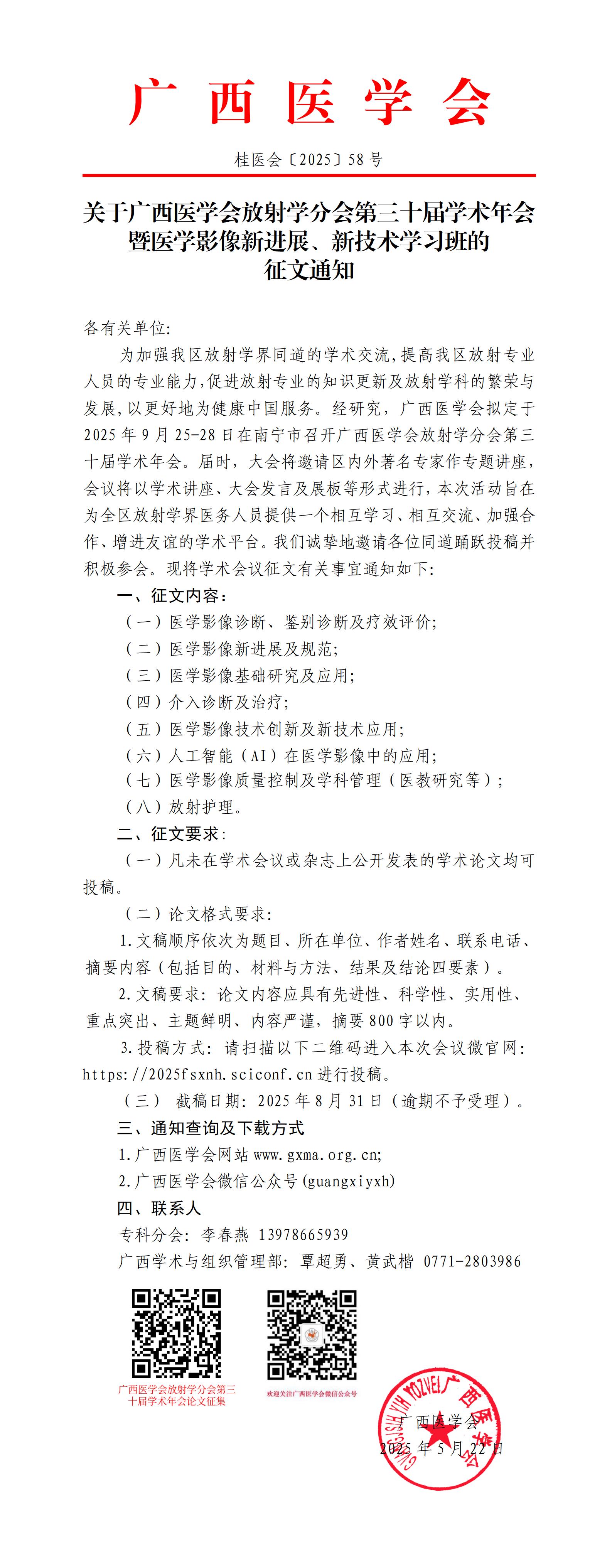 关于广西医学会放射学分会第三十届学术年会暨医学影像新进展、新技术学习班的征文通知