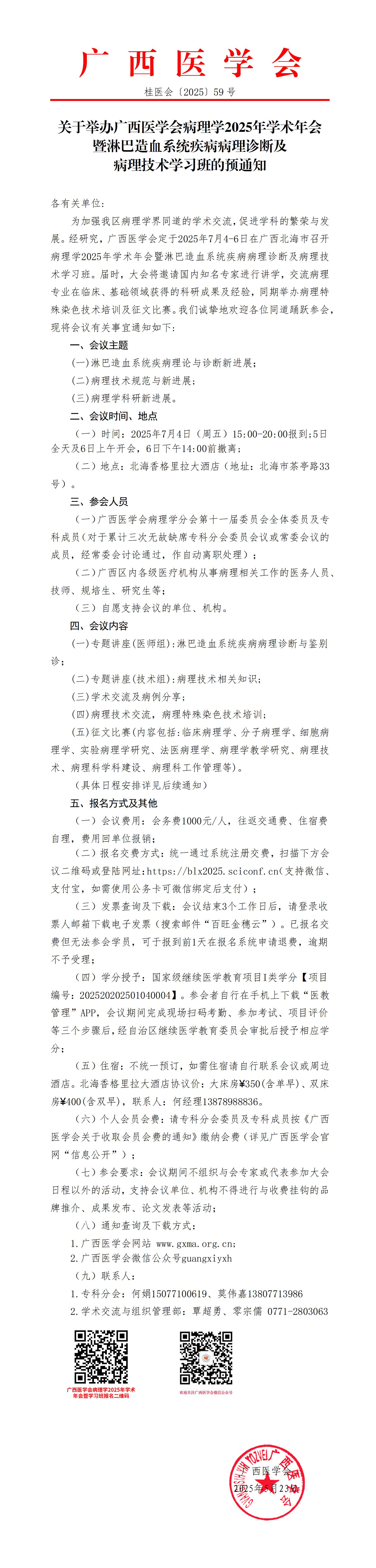 关于举办广西医学会病理学2025年学术年会暨淋巴造血系统疾病病理诊断及病理技术学习班的预通知
