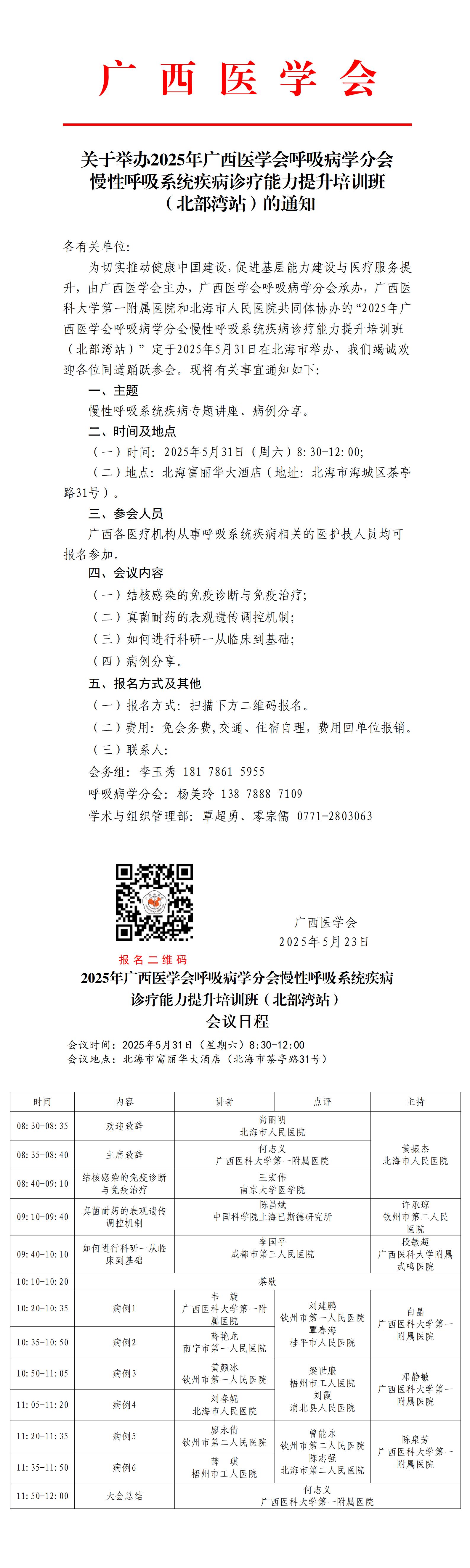 关于举办2025年广西医学会呼吸病学分会慢性呼吸系统疾病诊疗能力提升培训班 (北部湾站)的通知