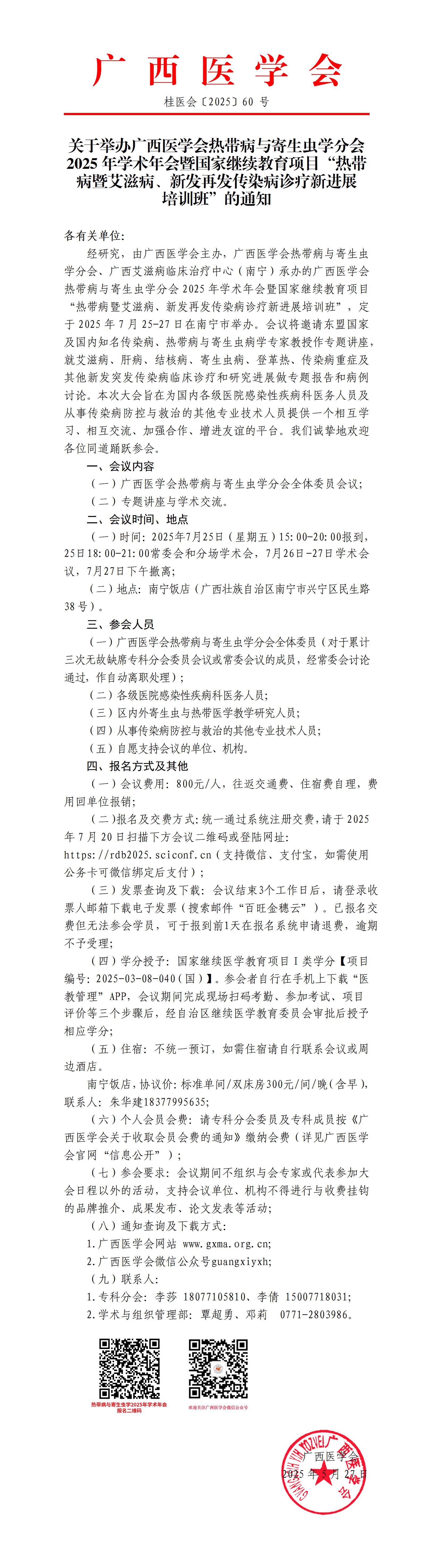 关于举办广西医学会热带病与寄生虫学分会2025年学术年会暨国家继续教育项目“热带病暨艾滋病、新发再发传染病诊疗新进展培训班”的通知