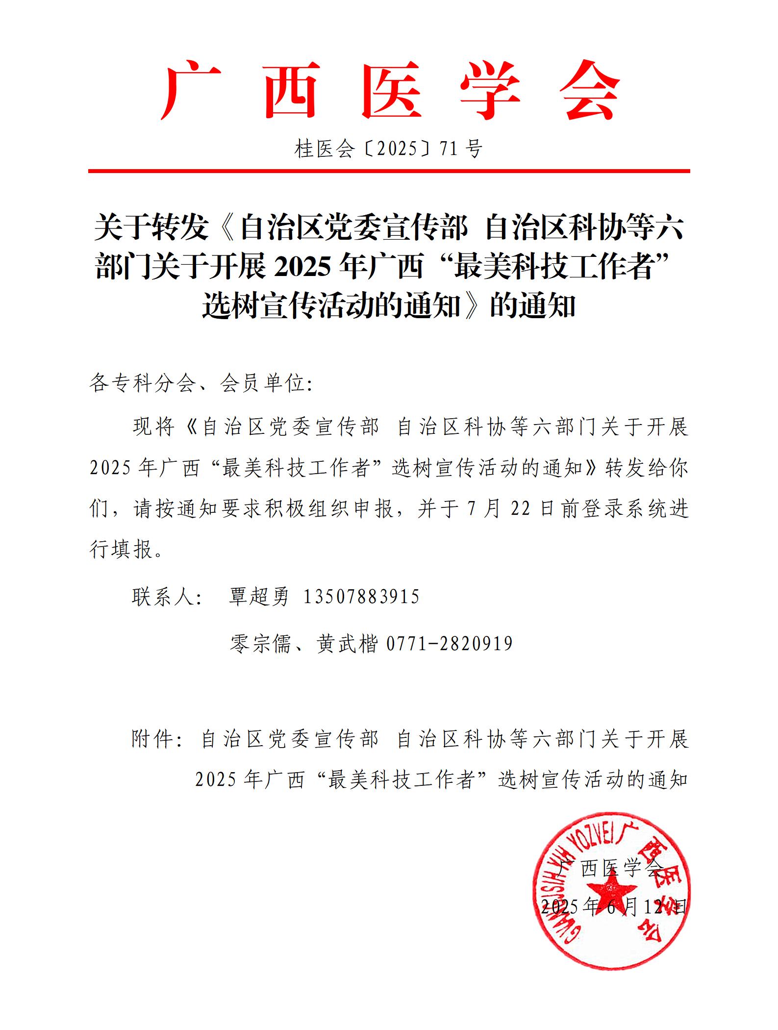 关于转发《自治区党委宣传部 自治区科协等六部门关于开展2025年广西“最美科技工作者” 选树宣传活动的通知》的通知