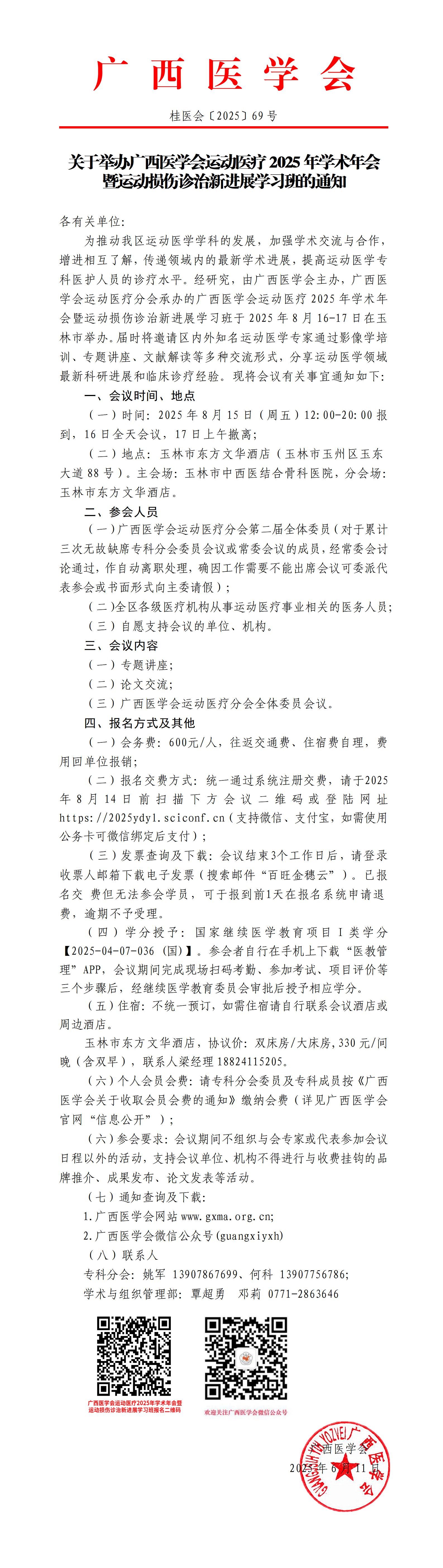 关于举办广西医学会运动医疗2025年学术年会暨运动损伤诊治新进展学习班的通知