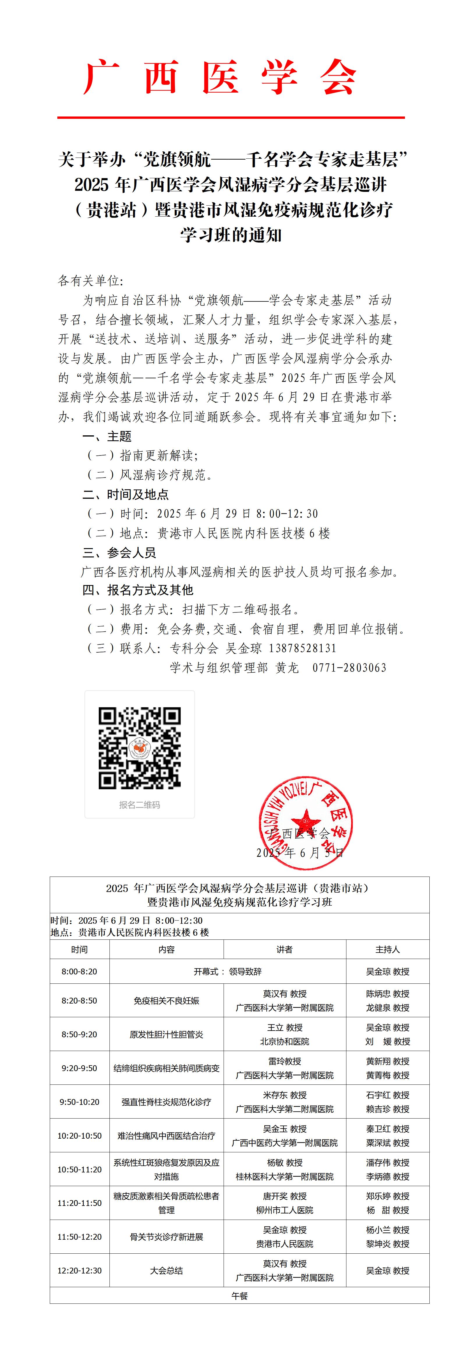 关于举办“党旗领航——千名学会专家走基层”2025 年广西医学会风湿病学分会基层巡讲(贵港站)暨贵港市风湿免疫病规范化诊疗学习班的通知