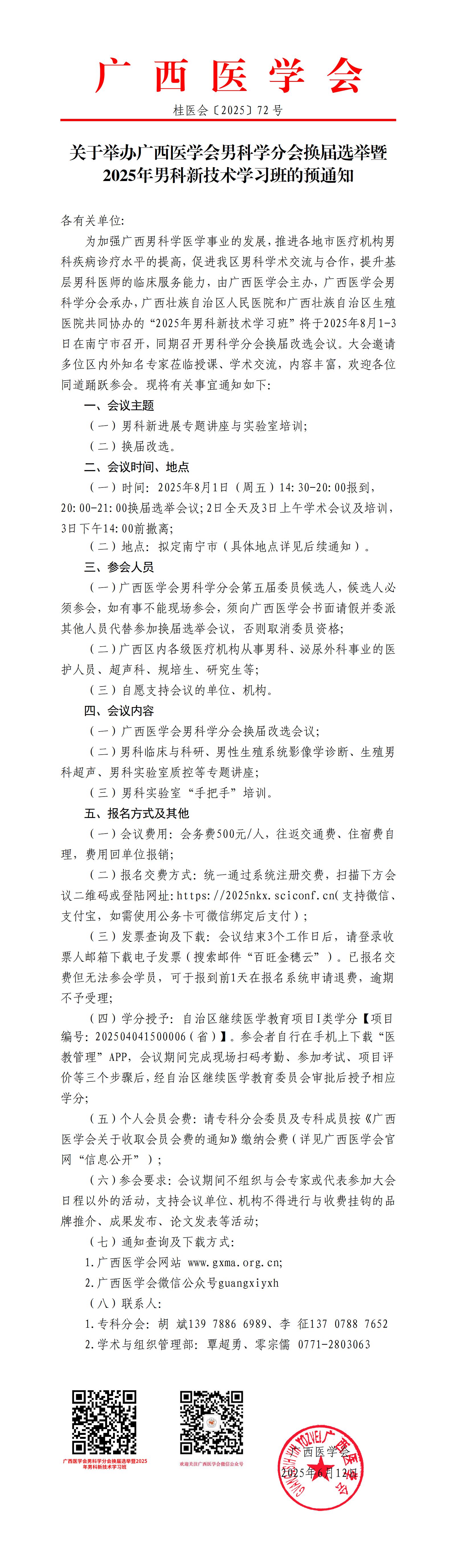 关于举办广西医学会男科学分会换届选举暨2025年男科新技术学习班的预通知