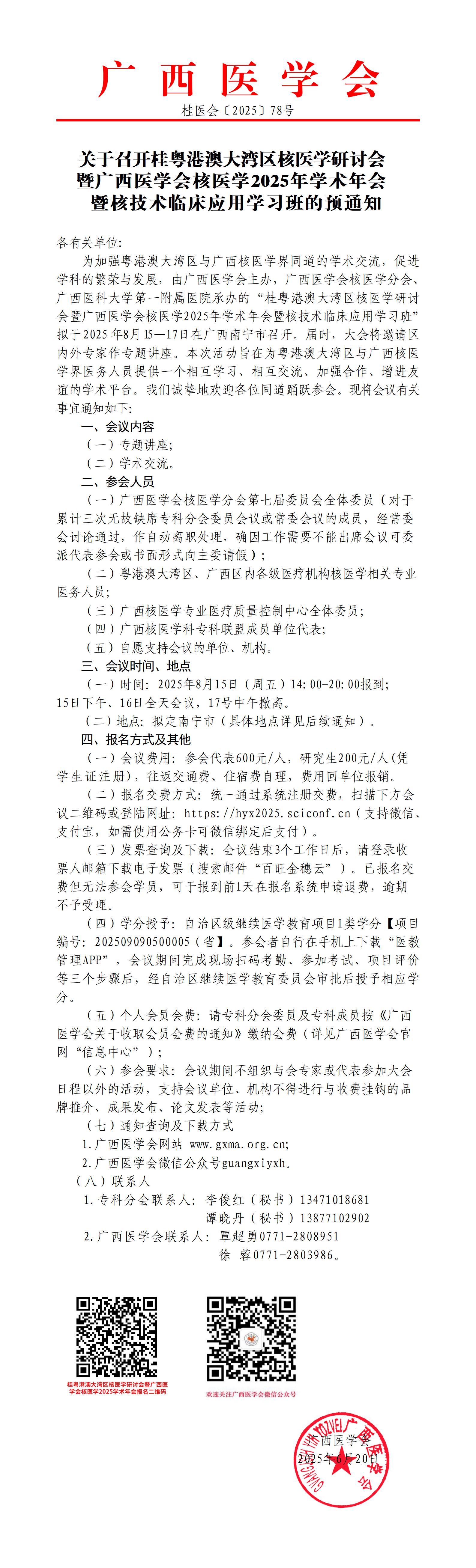 关于召开桂粤港澳大湾区核医学研讨会暨广西医学会核医学2025年学术年会暨核技术临床应用学习班的预通知