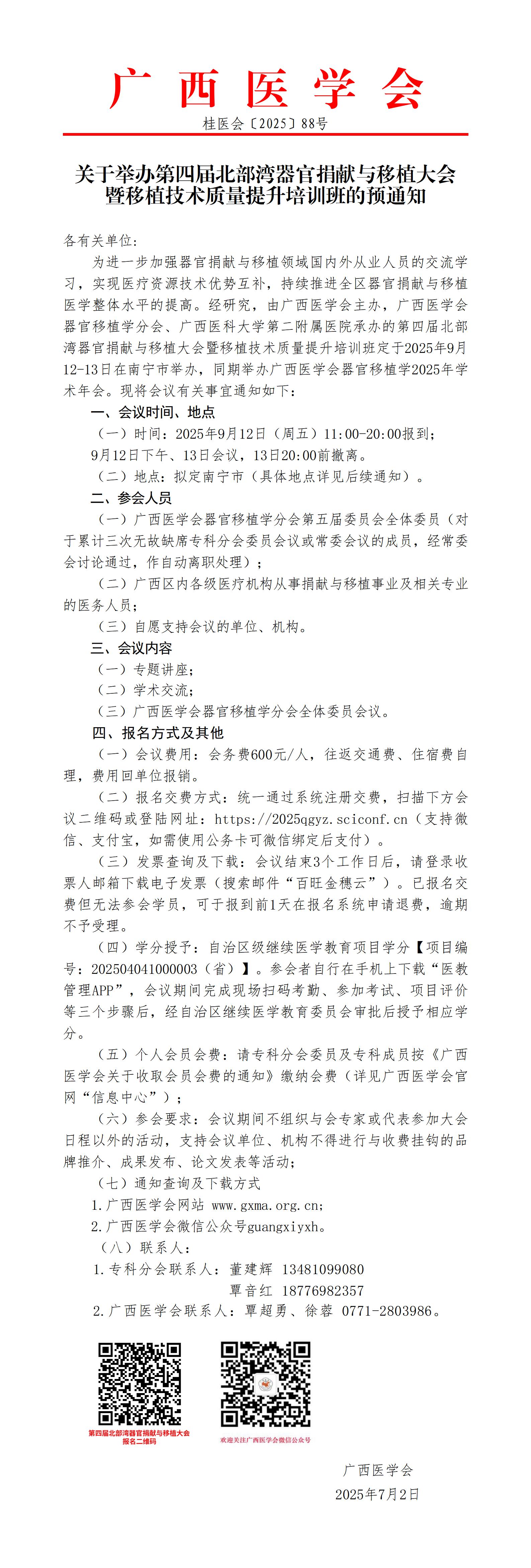 关于举办第四届北部湾器官捐献与移植大会暨移植技术质量提升培训班的预通知