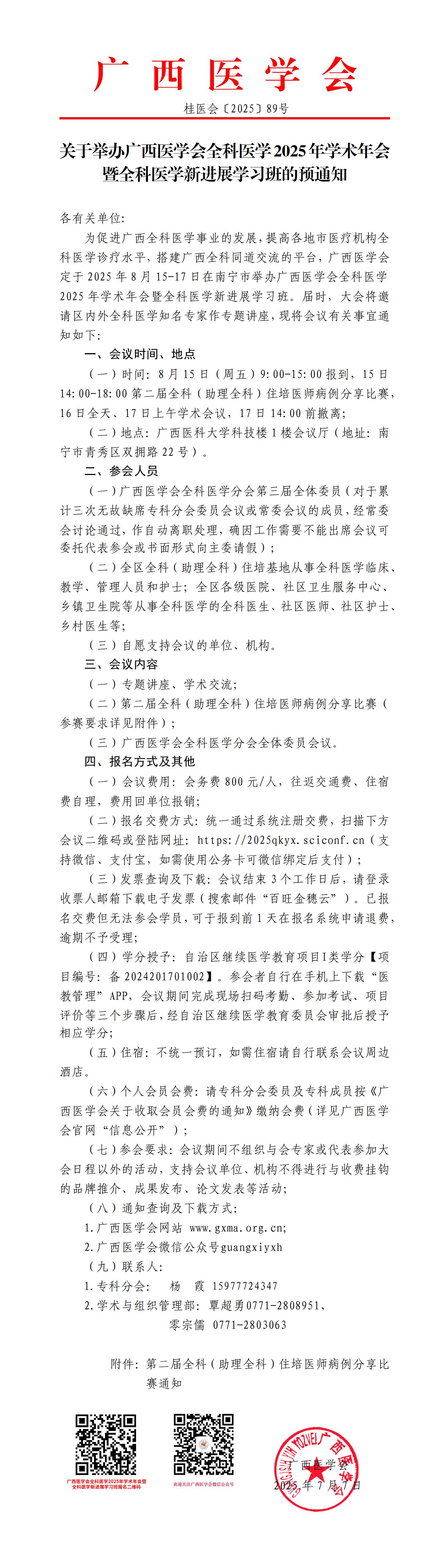 关于举办广西医学会全科医学2025年学术年会暨全科医学新进展学习班的预通知