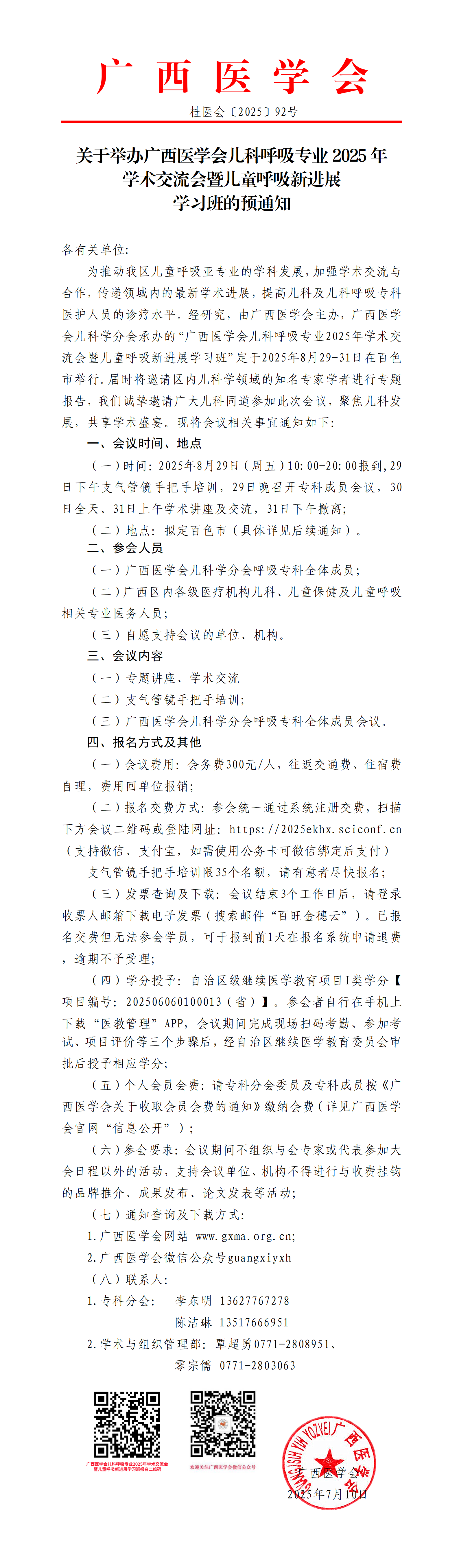 关于举办广西医学会儿科呼吸专业2025年学术交流会暨儿童呼吸新进展学习班的预通知