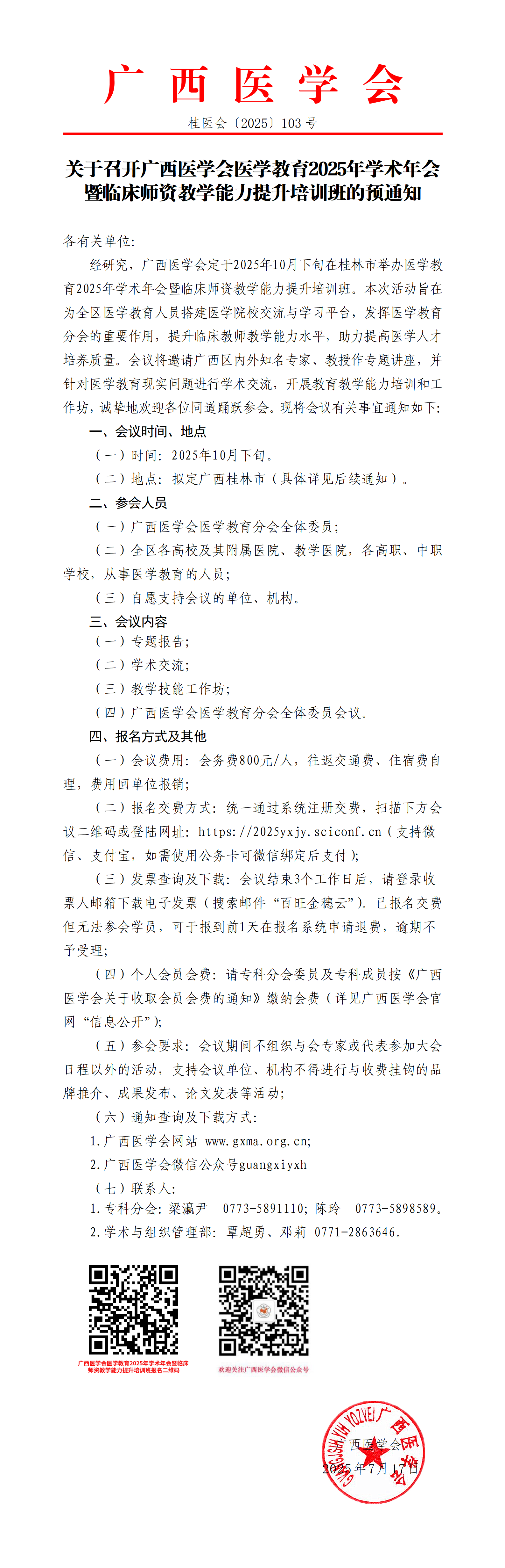 关于召开广西医学会医学教育2025年学术年会暨临床师资教学能力提升培训班的预通知