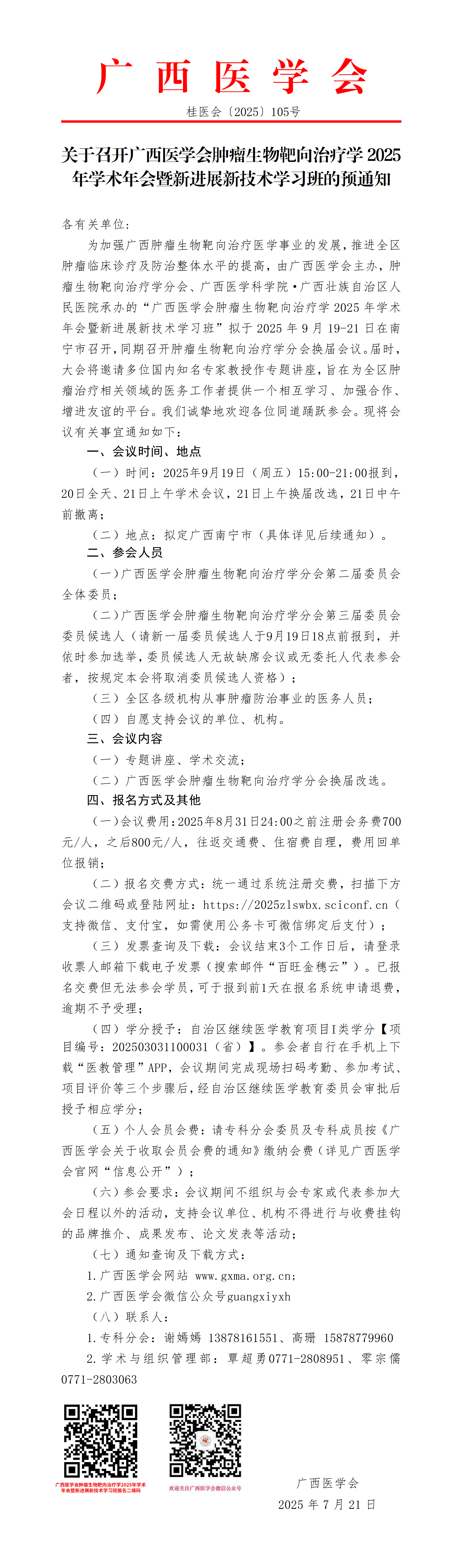 关于召开广西医学会肿瘤生物靶向治疗学2025年学术年会暨新进展新技术学习班的预通知