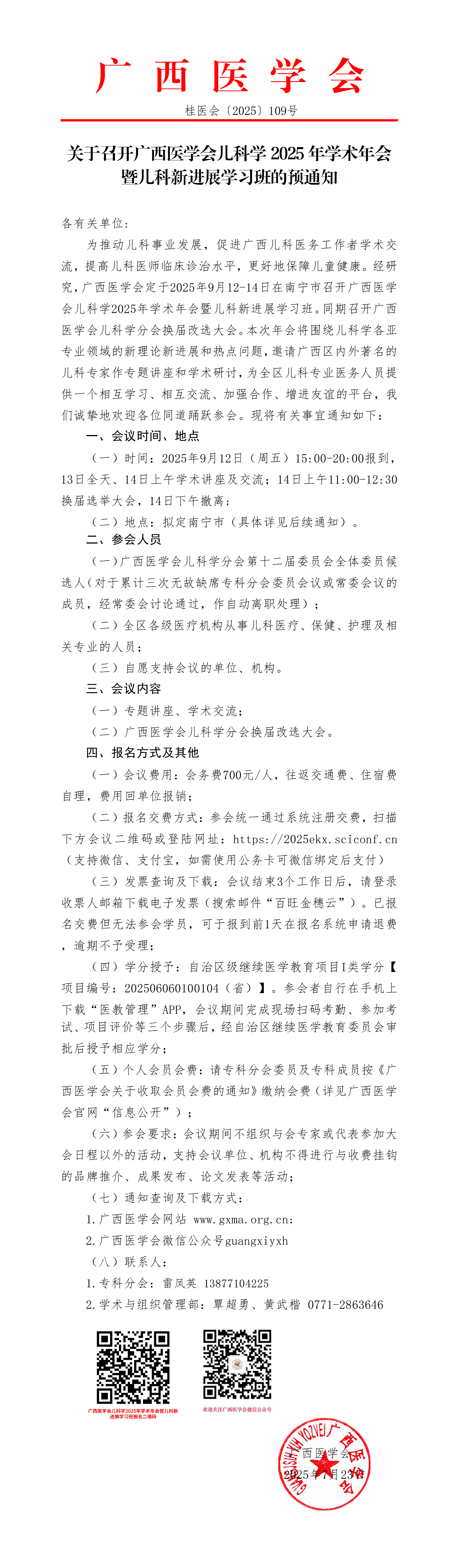 关于召开广西医学会儿科学2025年学术年会 暨儿科新进展学习班的预通知