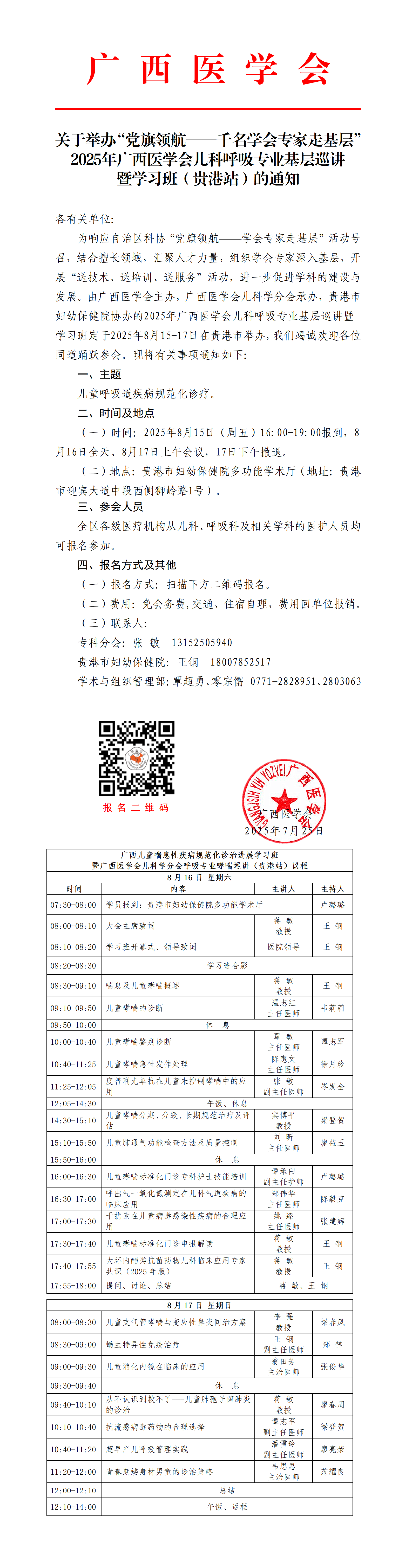 关于举办“党旗领航——千名学会专家走基层” 2025年广西医学会儿科呼吸专业基层巡讲 暨学习班(贵港站)的通知