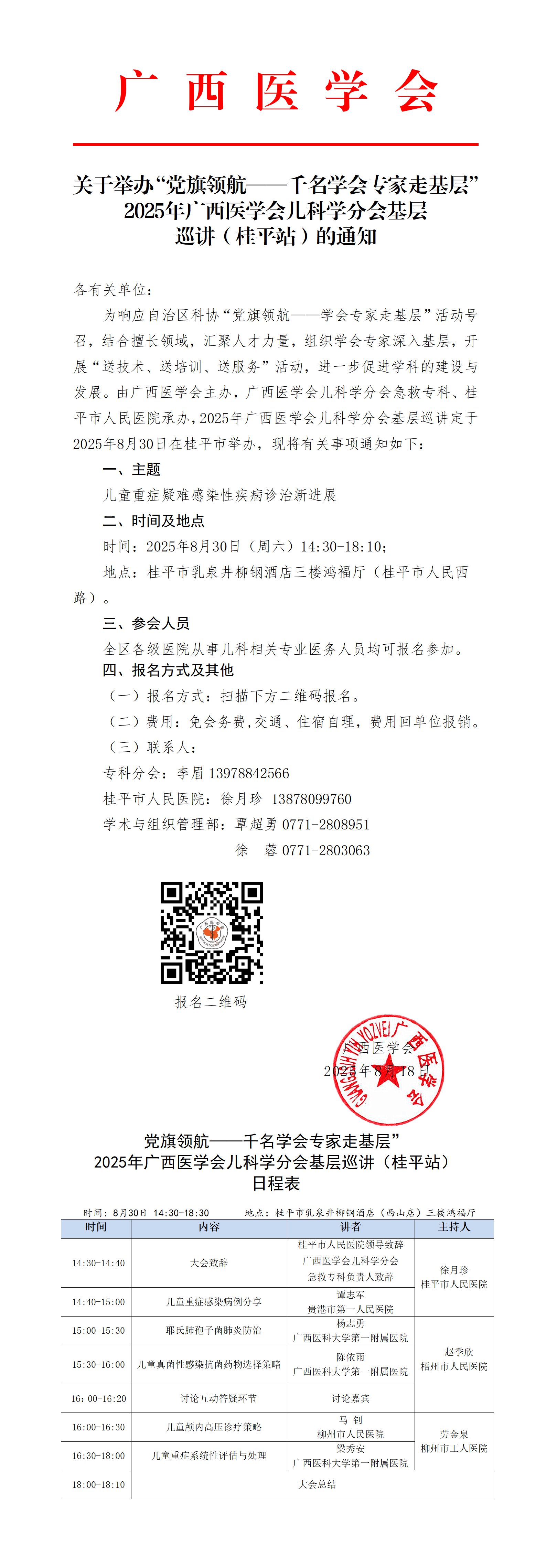 关于举办“党旗领航——千名学会专家走基层” 2025年广西医学会儿科学分会基层 巡讲(桂平站)的通知